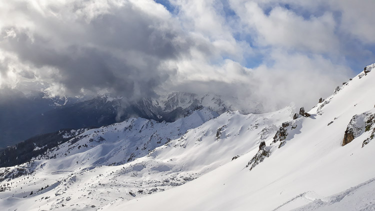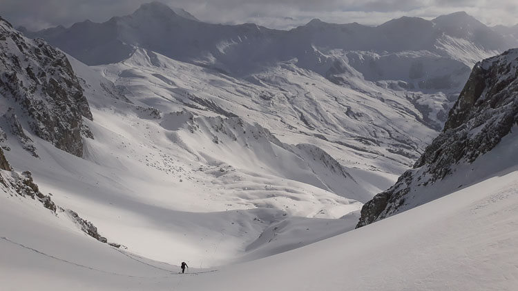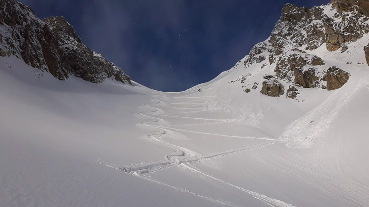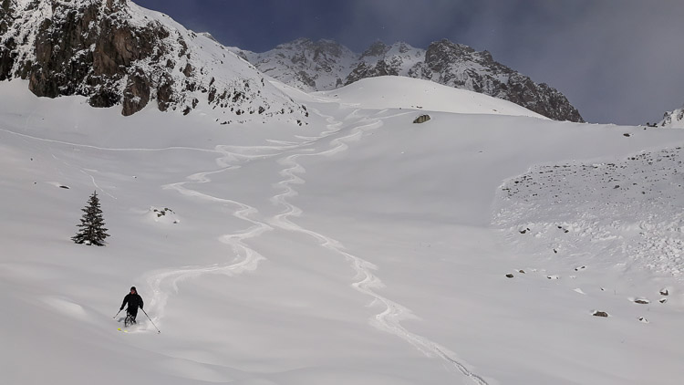 Un peu d'accumulation sous le vent de Nord (passage dense en Rd du col de Sarvatan)