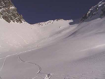 Partis pour la Roche Blanche en traversée (montée de la face NW, descente de la face SW), nous nous sommes ravisés après avoir déclenché une plaque à vent et fissuré une autre un peu plus haut dans la face NW. Nous nous sommes donc repliés sur le col frontière de Stroppia, où à part les 100 premiers mètres, une poudreuse d'écriture nous attendait. Attention de nombreuses plaques sont présentes dans tout le secteur !!!!