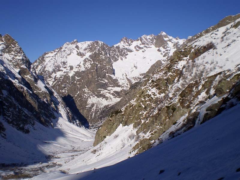 Mon retard dû à mon erreur d'itinéraire ainsi que ma progression assez lente n'ont pas été dommageables car la neige dans le Petit Vallon est bien transformée mais assez peu tassée. Du coup, on a intérêt à la descendre la plus chaude possible : les poils sont ultra-longs (10 à 20 cm) mais le ski est agréable. Je n'ai pu atteindre le col (stop 5 m en dessous) en raison d'une épaisse couche de gobelets qui fuyait sous mes chaussures. Il aurait fallu un peu de matos pour prendre appui sur le rocher. Un skieur y est monté il y a quelques jours (sans doute neige plus portante) pour descendre du col, au prix de quelques acrobaties sans doute (c'est plus qu'étroit). J'ai chaussé 10 m sous le col à 15 h environ. Vu personne aujourd'hui mais de nombreuses traces de raquettes et de skis le long de la Bonne.