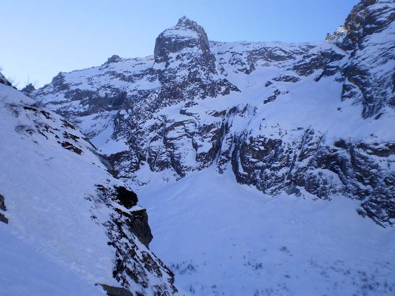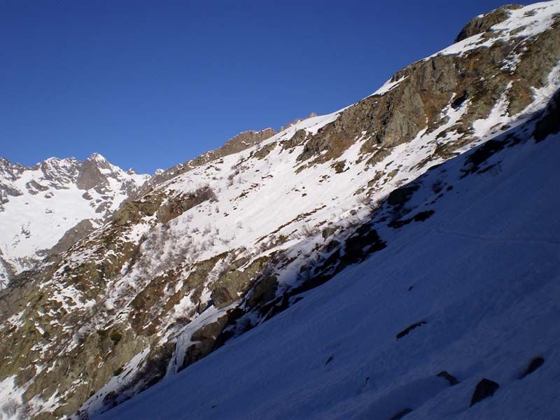 Dans la pénombre, j'ai bifurqué juste après la cabane de Chatellerat. Erreur ! Montée en crampons expo en haut pour buter en haut d'une barre vers 2000. Demi-tour prudent et seconde erreur en voulant rester à niveau vers 1900. Le tout m'a bien coûté 2 heures et une certaine perte d'énergie... Du coup, j'ai tout juste dépassé les 2000 de dénivelé. À la descente, je voulais emprunter un très beau couloir-ravin orienté ouest qui démarre vers 2350 sous le col 2474 dans l'arête de la Maximin, mais on est obligé de remonter vers 2400 pour l'attaquer, ce qui m'a dissuadé. De plus, je n'étais pas du tout sûr que la neige y soit bonne (trois skieurs y ont laissé leurs traces, sans doute il y a quelques jours) et celle sous le Petit Vallon était en moquette correcte puis en tranfo un peu molle mais encore bien stable.