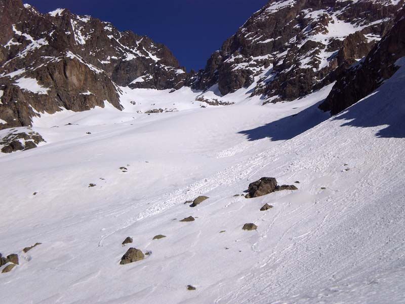 Conditions toujours aussi saines, même s'il faudra se méfier de quelques zones remplies de faces planes en cas de nouvelles chutes. Très peu de coulées dans les deux Vallons, si l'on compare aux autres années. Quelques-unes quand même dans les pentes sous la cabane du Petit Vallon. Quelques coulées de neige récente sous les rochers de l'arête sud-ouest de la Maximin. Les pentes entre 1850 et 2137, assez exposées entre 1900 et 2100 (E2 ?) sont en bonne transfo et la neige avait peu chauffé à ma descente vers 16 h.