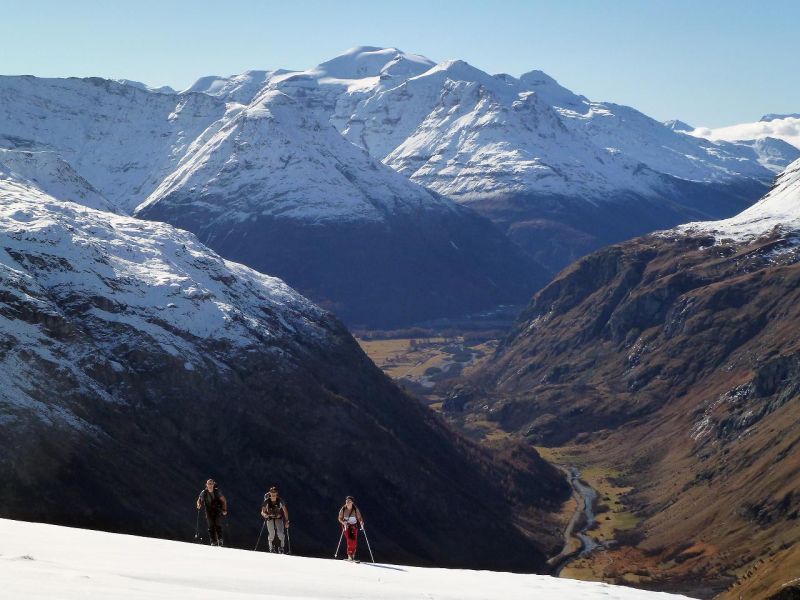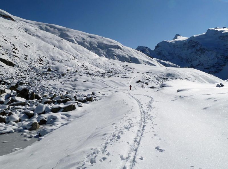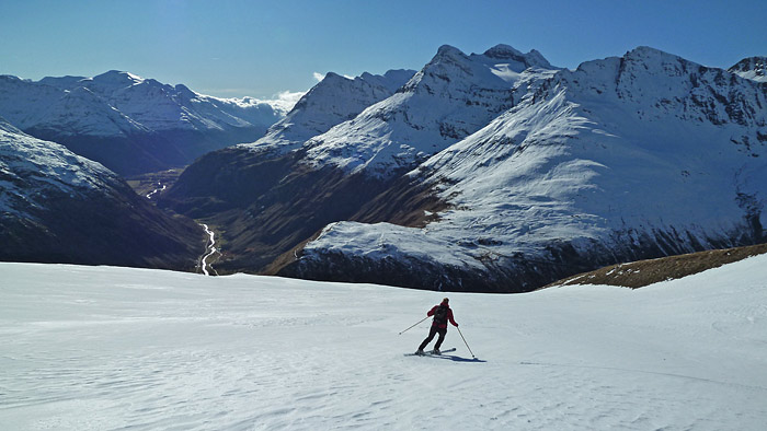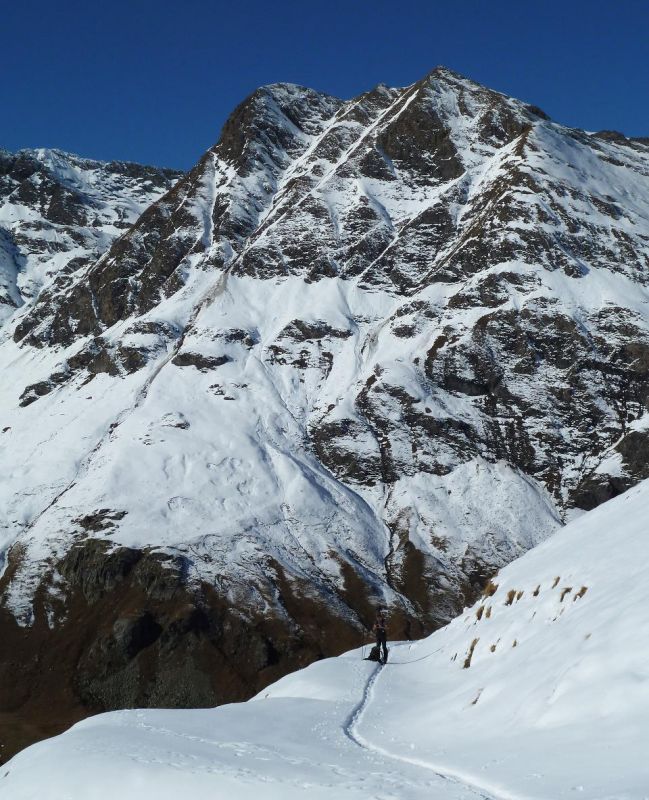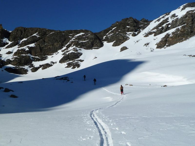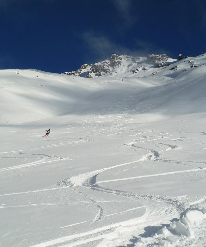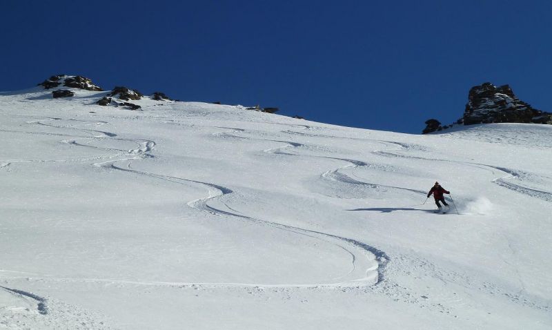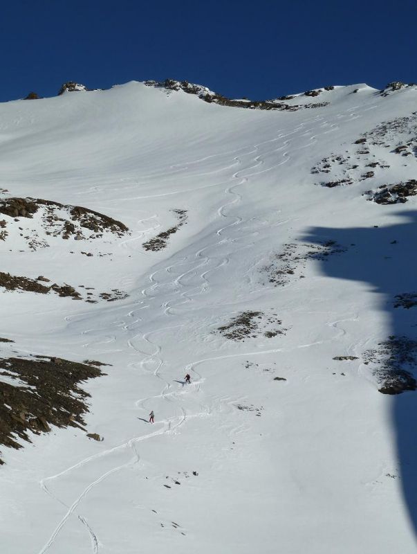 La limite skiable se situe vers 2400 en versants sud, un peu moins en versants nord (mais gaffe aux pierriers superficiellement recouverts). C'est bien plâtré en altitude, mais se méfier de certains glaciers, comme le Mulinet, dont les crevasses ne sont pas bien bouchées.