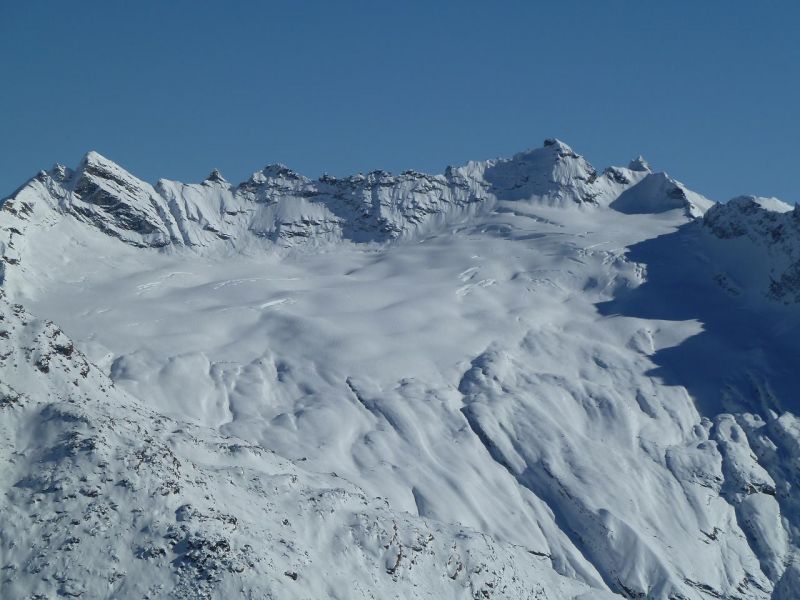 Deux plaques déclenchées (la veille ?) par trois skieurs dans le petit couloir nord de la pointe des Arses. De visu le vent a travaillé sur les glaciers de la zone frontalière.