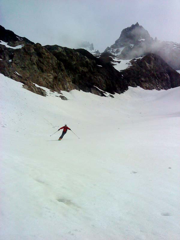 Très belle course, qui était dans des conditions quasi idéales, à l'exception des pentes non regelées entre 2400 et 2800. Sans aucune transition, on passe au-dessus à un vrai billard. Neige encore tendue entre 3500 et 3400 à 10h30 (le soleil arrive tout juste) puis moquette superbe à poils très ras. Une section en neige molle moyenne entre 2800 et 2700 puis neige de névé molle très skiante en RD jusqu'à proximité du refuge. Touché un caillou à l'arrivée. Les nuages ont eu le bon goût de se lever au-dessus de l'altitude du refuge et ils n'avaient sans doute pas été très présents pendant la nuit >2800.