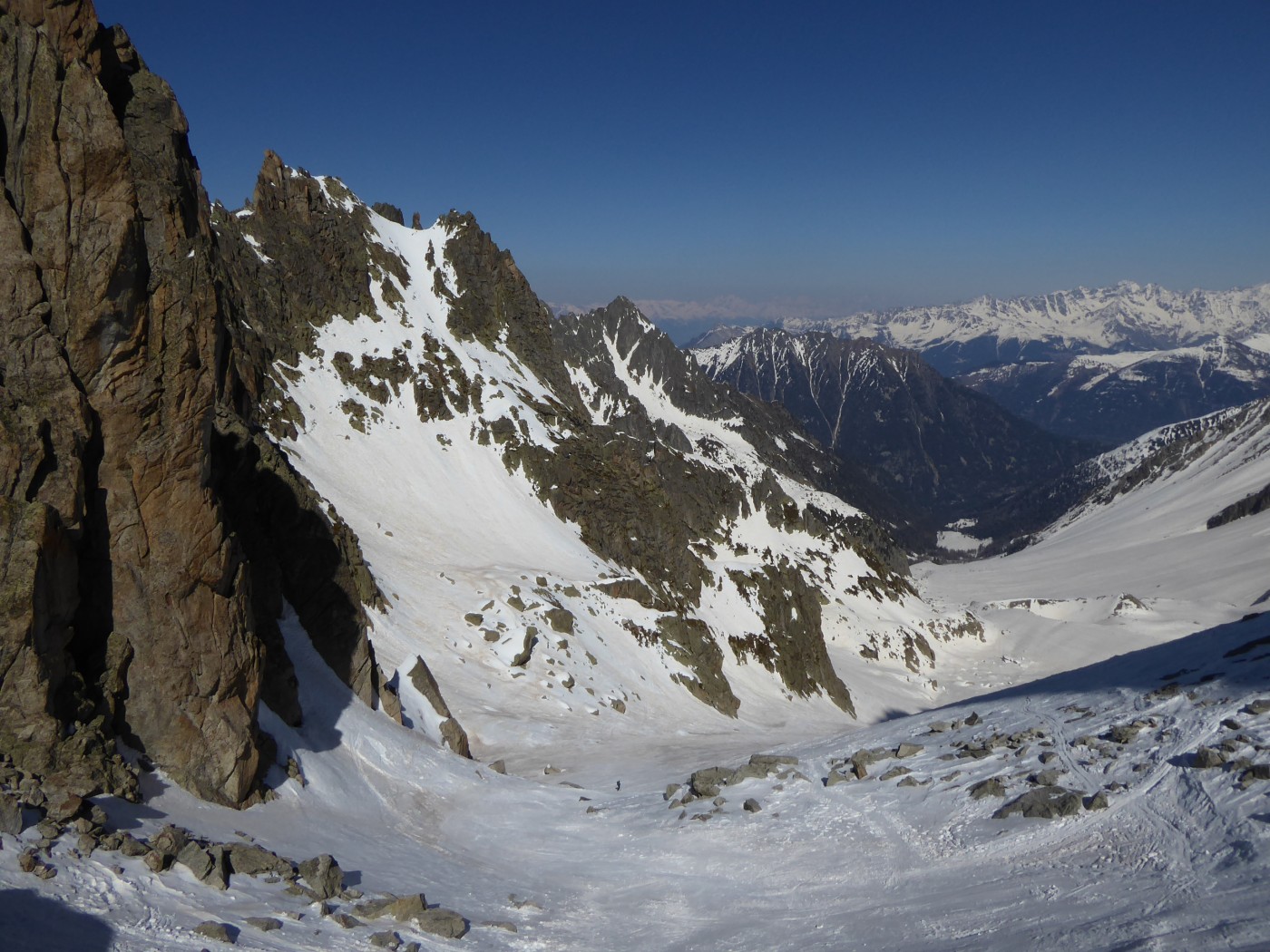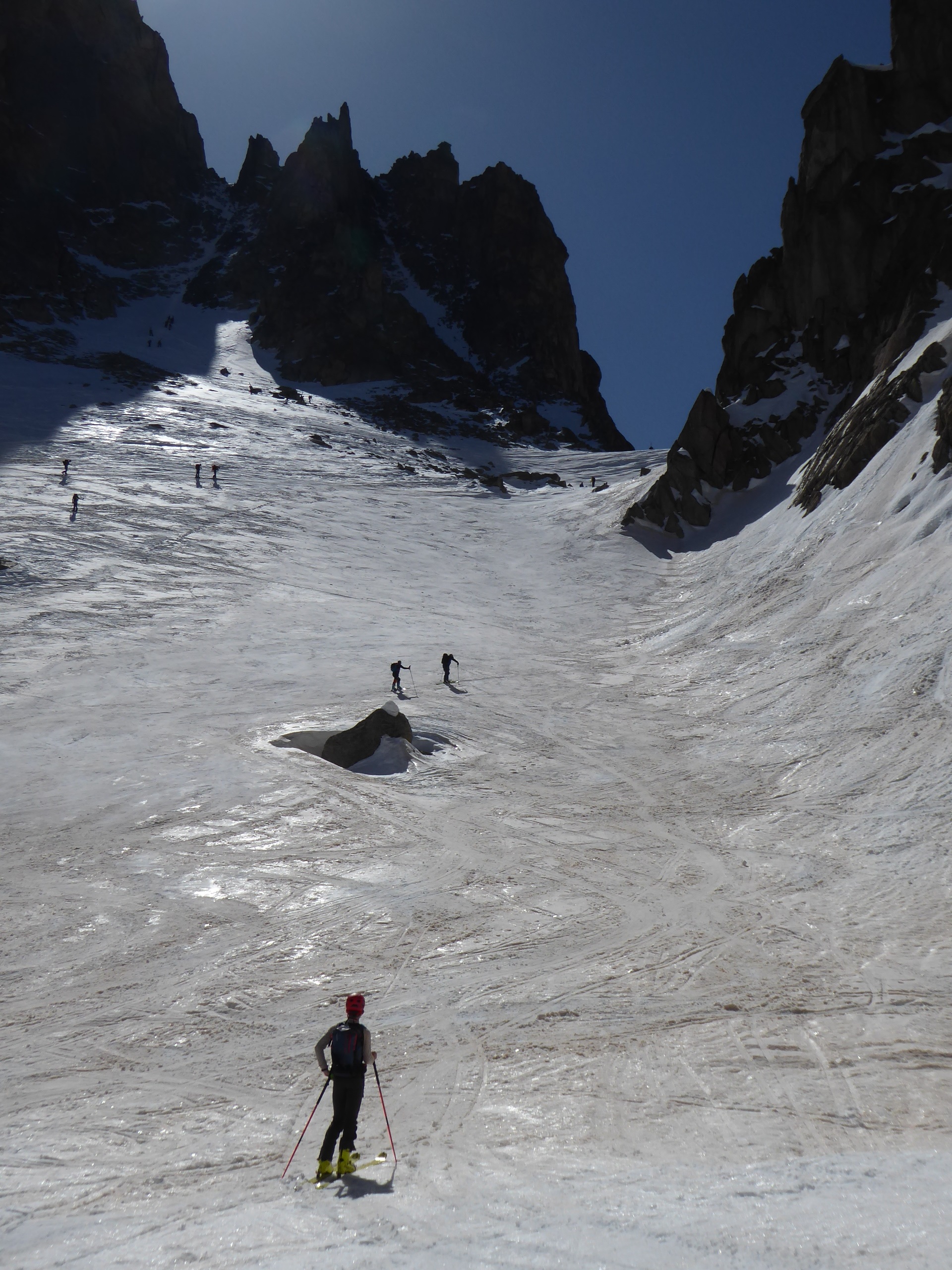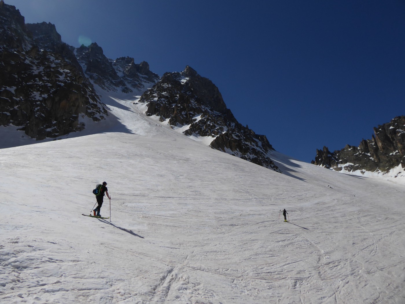 Le val d'Arpette est particulièrement fréquenté à cette période de la saison entre ceux qui l'empruntent à la montée pour gagner la cabane du Trient, ceux qui, engagés sur Chamonix-Zermatt, le descendent et ceux qui le parcourent à la journée. Personne dans les couloirs de la rive droite hormis dans le NE de la petite pointe d'Orny et ceux qui l'ont remonté (env. 12) ne semblent pas l'avoir skié. Quelques skieurs à la fenêtre d'Arpette.