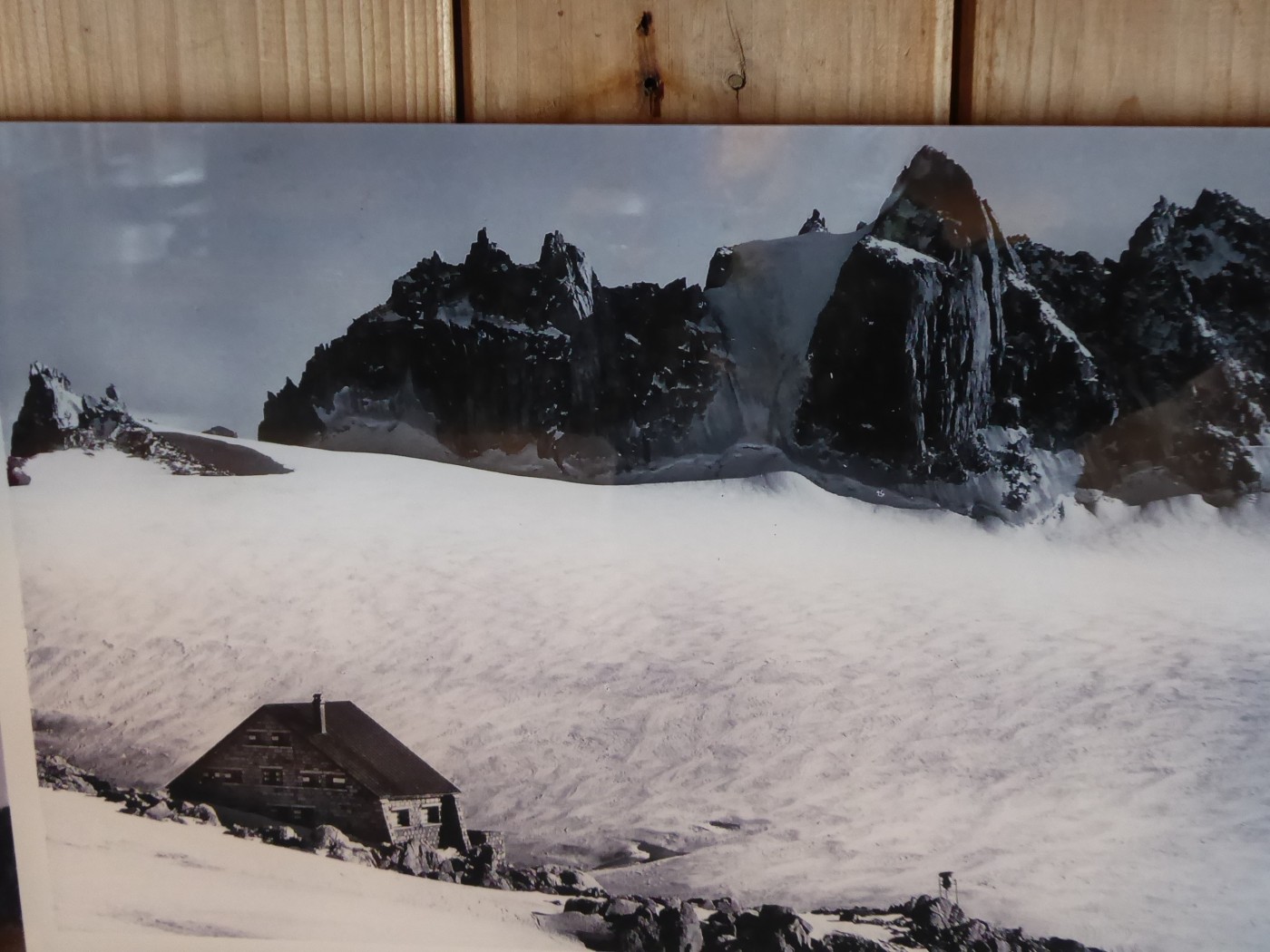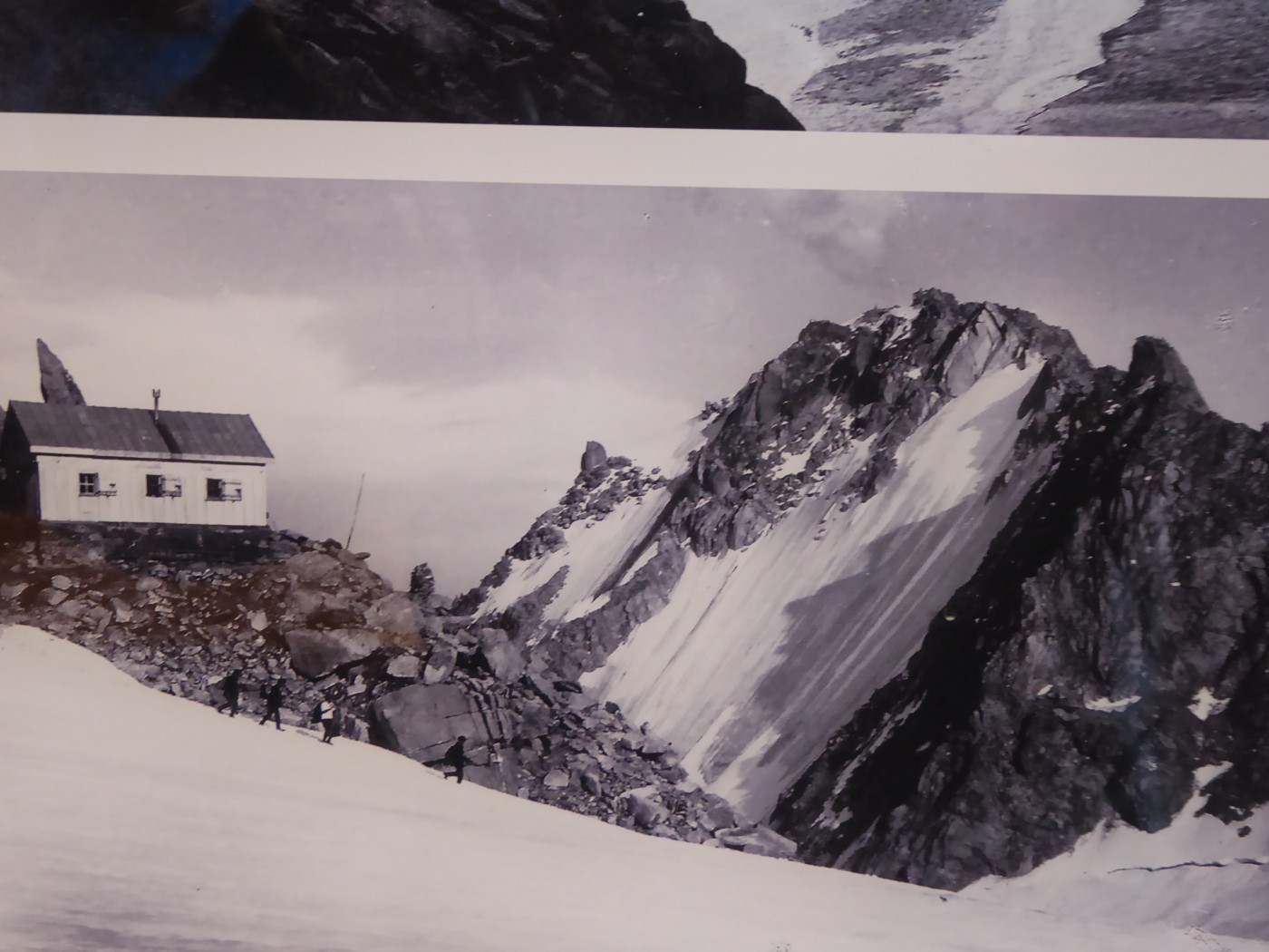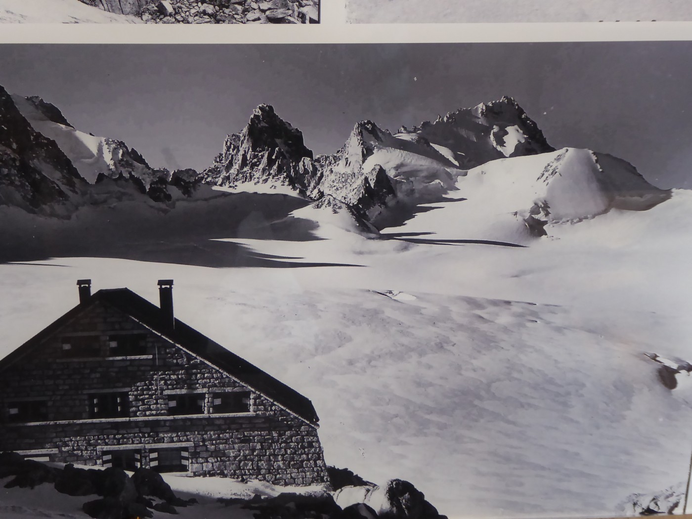Avec la neige tombée pendant la nuit et le vent, les groupes présents à la cabane et engagés sur la Haute Route ont préféré redescendre sur Champex via le col des Ecandies. Nous comptions aussi traverser vers la cabane de Saleina mais nous nous sommes finalement arrêtés au col des Plines pour revenir à la cabane de Trient. Les photos accrochées au mur de la salle à manger de la cabane (qui datent de 1934) permettent de se rendre compte de l'évolution des faces du secteur.