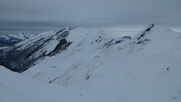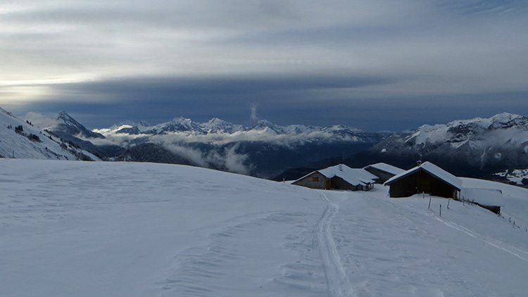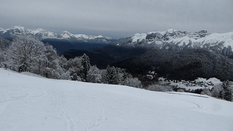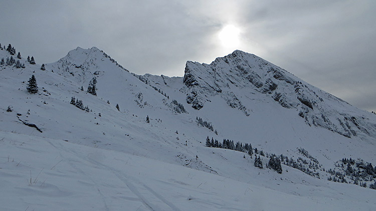 Avec un démarrage après les éclaircies matinales, la balade dominicale au pied du Charvin allait s'écourter sous ce ciel gris, avec une nivo pas top et un manteau encore trop faiblard vers 1700. Mais une dernière éclaircie et un regain de motiv' finiront de me convaincre de pousser jusqu'au Porthets.