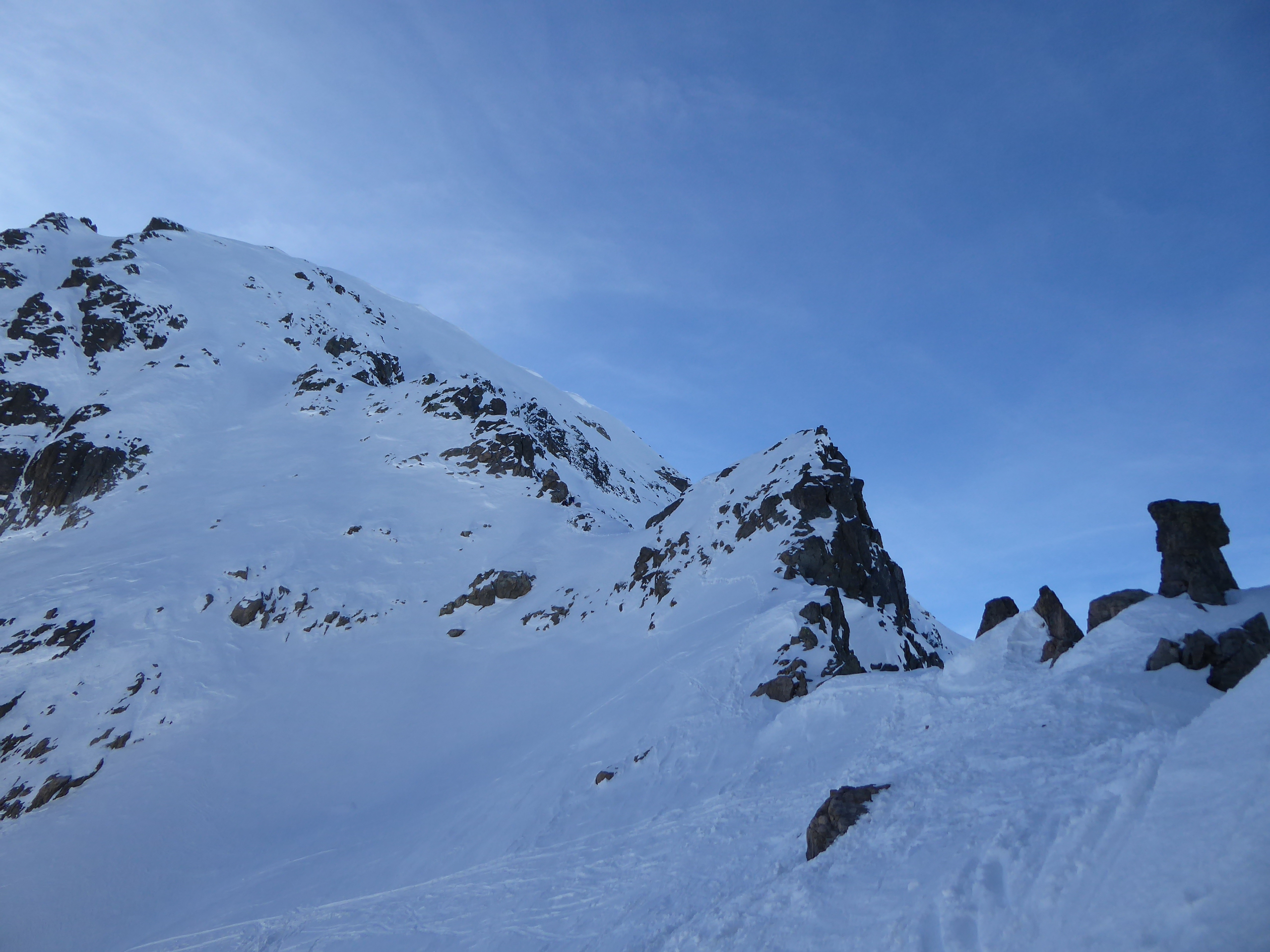 Malgré les nombreuses traces en neige croutée dans la partie haute, il y avait encore moyen de faire quelques bons virages dans les pentes est dans une neige poudreuse sous une fine croute et en neige transformée dans les pentes sud. Le TK de la Floria ouvre ce week-end.