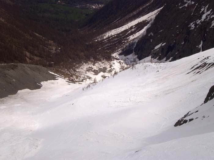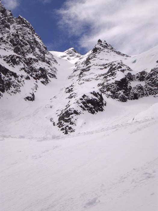 Le seul endroit où on hésite un peu, c'est entre 3000 et 3100 à la sortie du Davin. C'est très raide, un bon 45°, et bien chargé. Heureusement, le vent ne semble pas avoir trop soufflé ici, et on trouve de la neige homogène sur 50 à 70 cm relativement stable. Pas de sensation de danger enfoui, mais reste à voir en cas de redoux... À la descente, rien n'a bougé. Il faudra aussi se méfier des longues bandes de neige liée friable en rive droite entre 3000 et 2800 qui ne sont pas encore descendues.