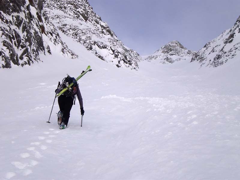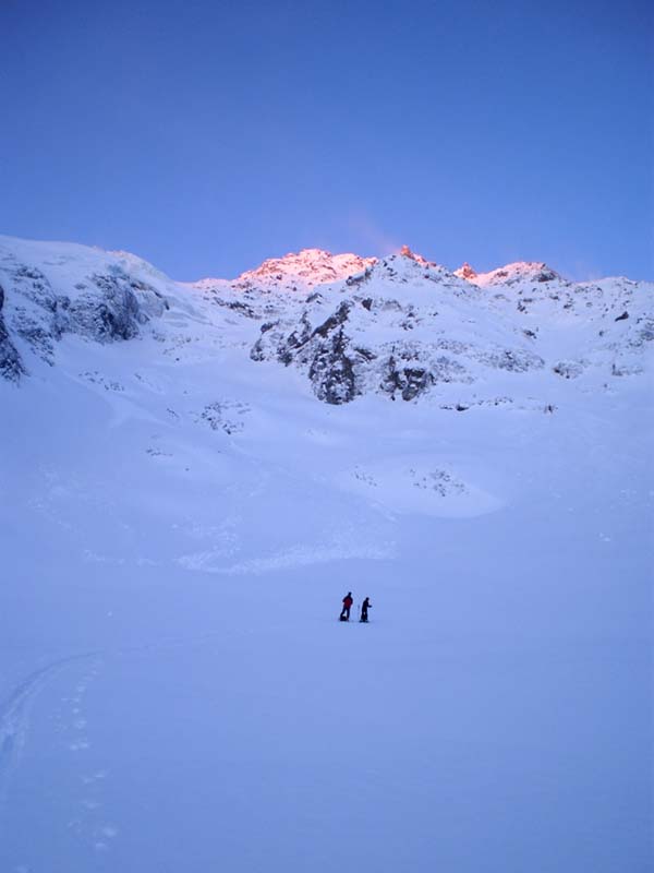 Sortie de droite qui demande de traverser vers la croupe un peu plus bas qu'avant en raison du retrait glaciaire et de la présence de rochers dans la sortie plus directe.