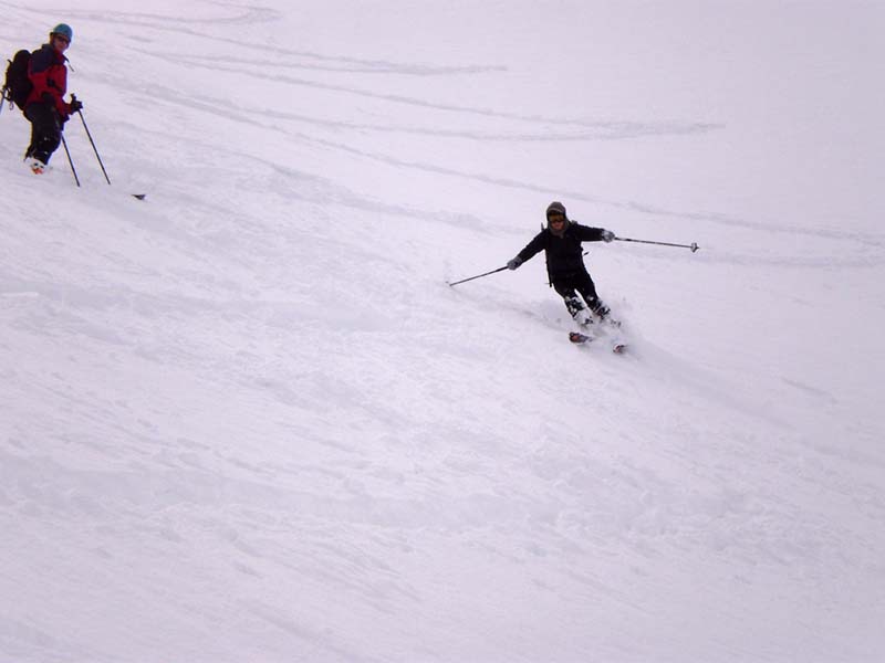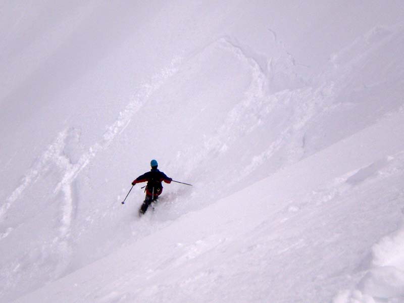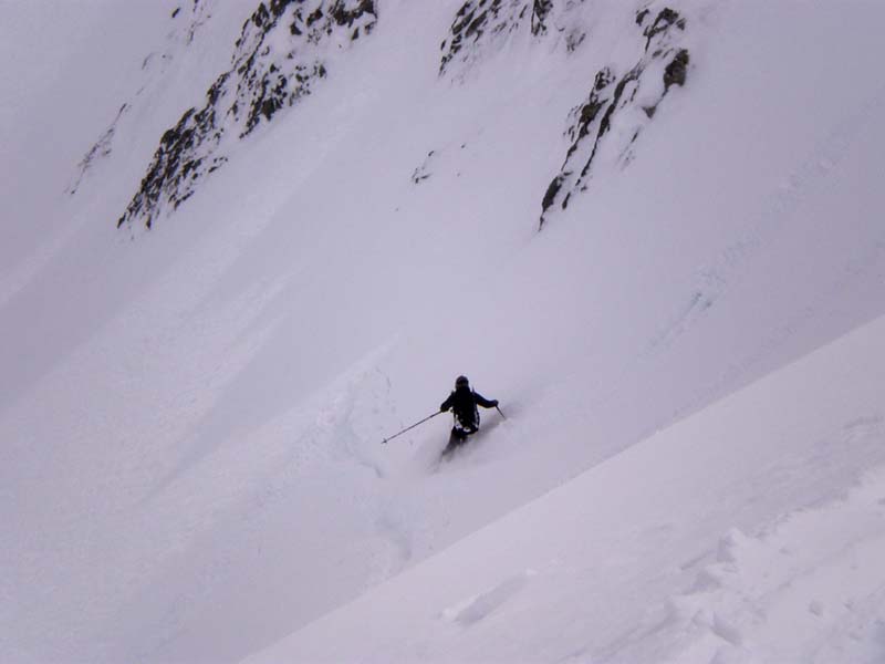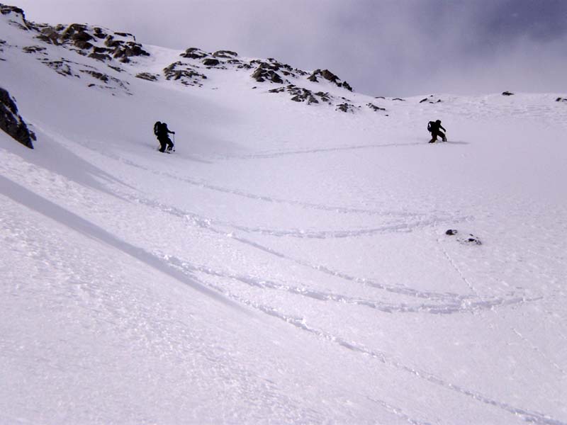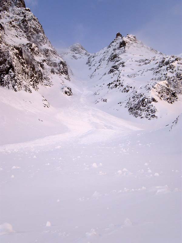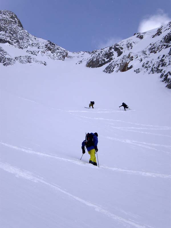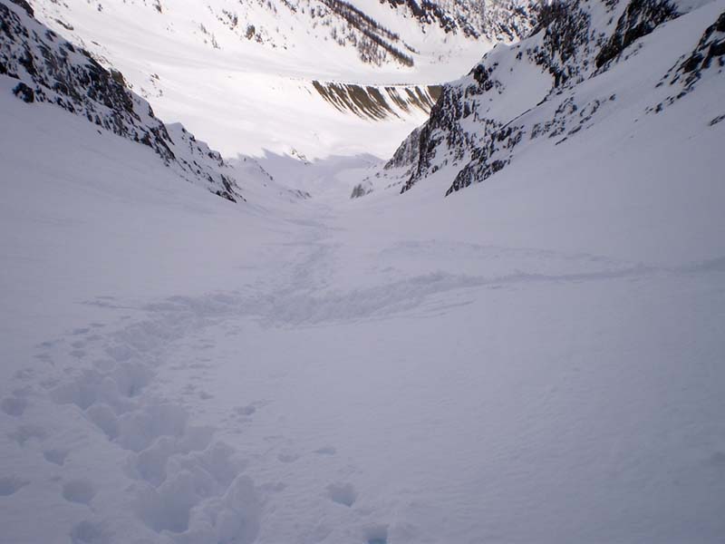 Vers 2800, nous avons eu des doutes en constatant que la couche de surface partait sous les skis dans les conversions et que nous découpions de petites plaques. Trois skieurs nous ont rattrapés au moment où nous nous décidions à repartir et ils ont fini la trace en prenant des précautions (espacement, etc.). La sortie à droite était délicate, mais finalement assez stable. Ils sont passés de la sortie de droite à celle de gauche par dessus et ont déclenché une plaque à la descente dans le passage à 50° qui s'est arrêtée dans le haut du couloir.