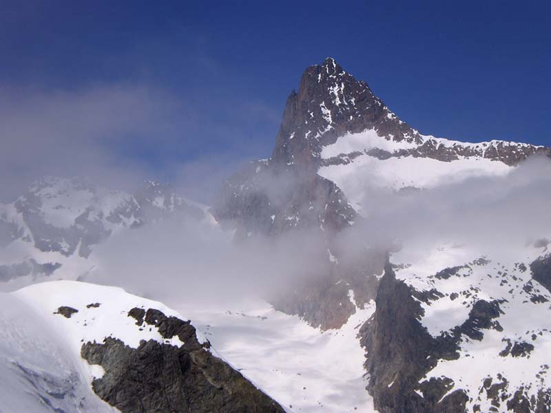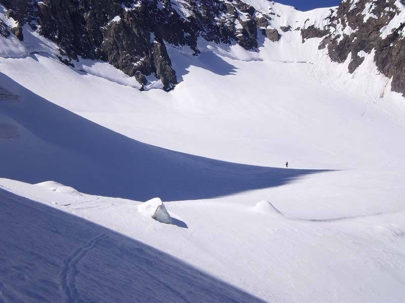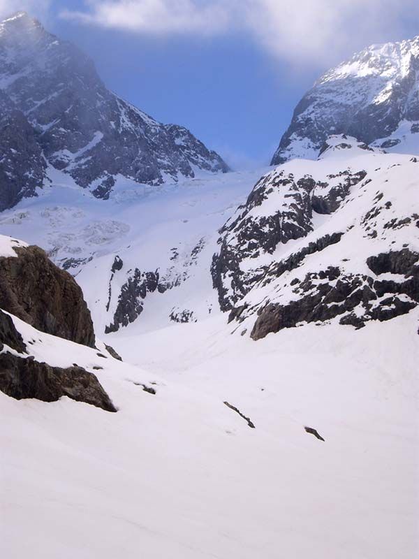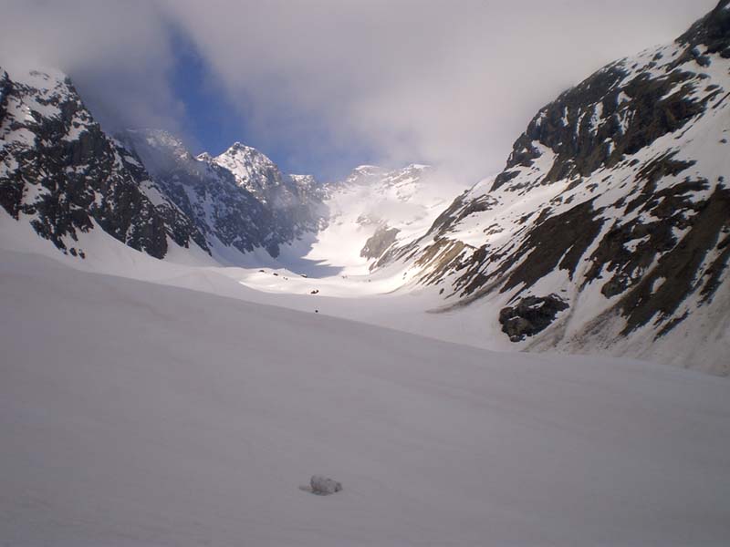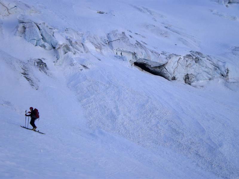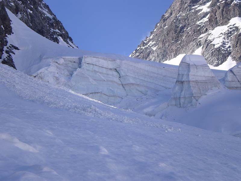 Beaucoup de purges se sont produites et il n'y a pas beaucoup de neige, pas de grosses coulées. Les conditions sont enfin assez saines. Le glacier est bien bouché et les crevasses supérieures ne se voient pas.