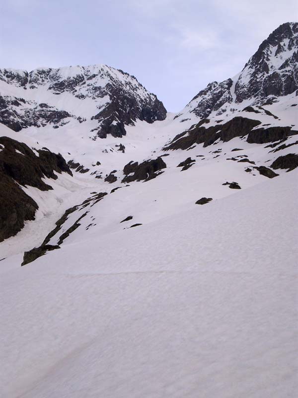 Depuis presque dix ans, il me manquait les 50 derniers mètres. Voilà qui est fait ! Le ski était excellent entre 3000 et 2300, belle moquette, grandes courbes... Mais j'aurais dû descendre une heure plus tôt, cela aurait été meilleur. Finalement, l'absence du soleil m'a bien arrangé, car cela a gardé la neige un peu au frais. Il aurait été utile seulement dans la partie finale, pas décaillée, mais bien skiable avec 2 cm d'une neige récente transformée et adhérente à la couche dure. Deux skieurs aux Rouies, très contents ; ils ont skié le couloir vers midi, il était encore dur. Pas touché un cailloux, mais il faut avoir l'œil... 3 ou 4 déchaussages, dont un pour franchir le torrent de Muande Bellone, pas évident, surtout le matin quand il fait encore nuit !