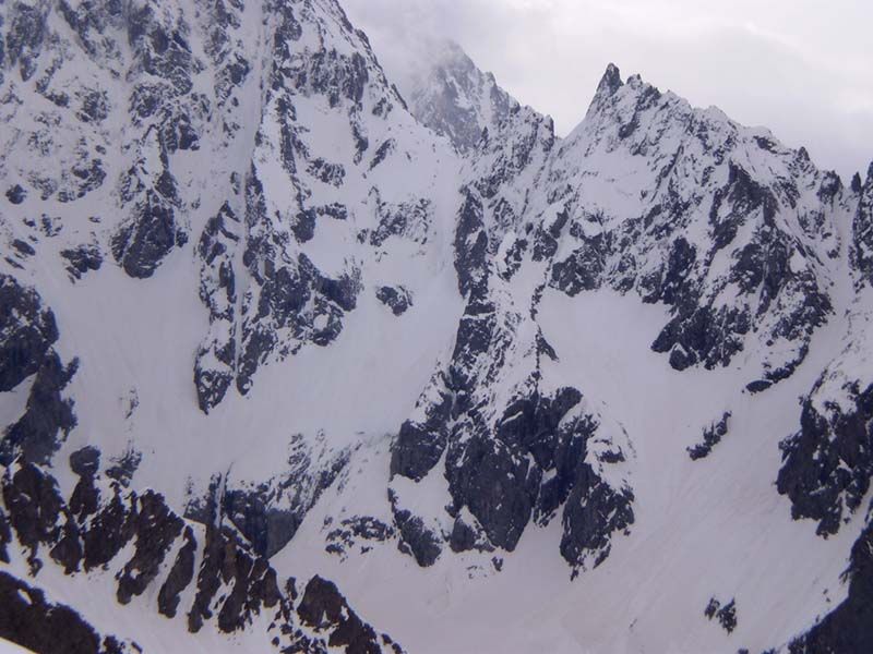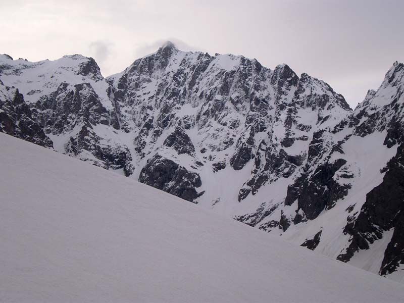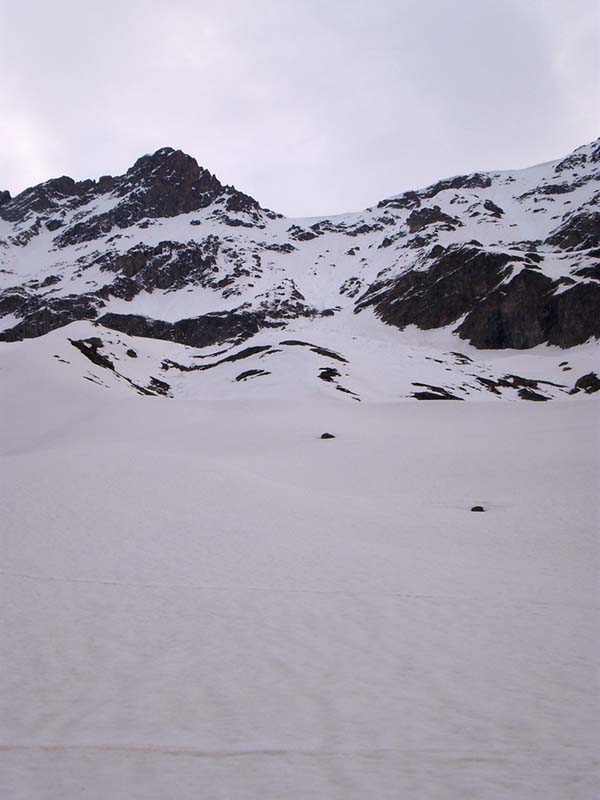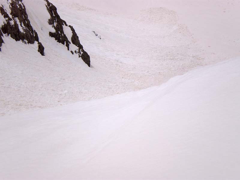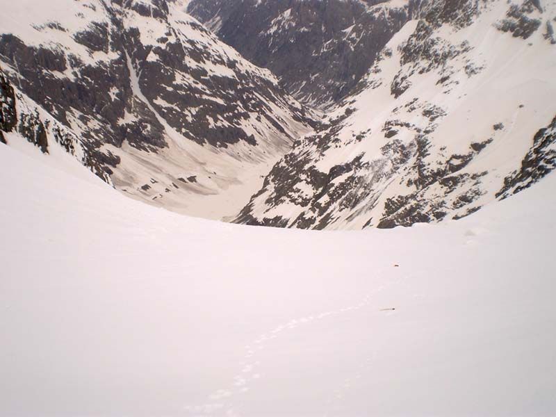 De belles coulées sont descendues sous le col jusque vers 2300. L'une d'elles est récente, car elle recouvre la trace de mes prédécesseurs qui sont dans doute venus la veille... Sinon, aujourd'hui, avec un bon regel >2300 et l'absence du soleil, rien n'a bougé.