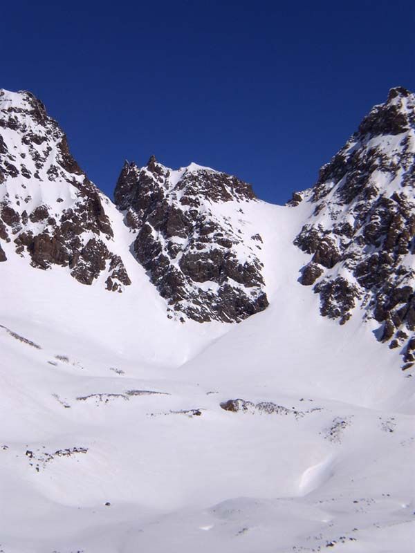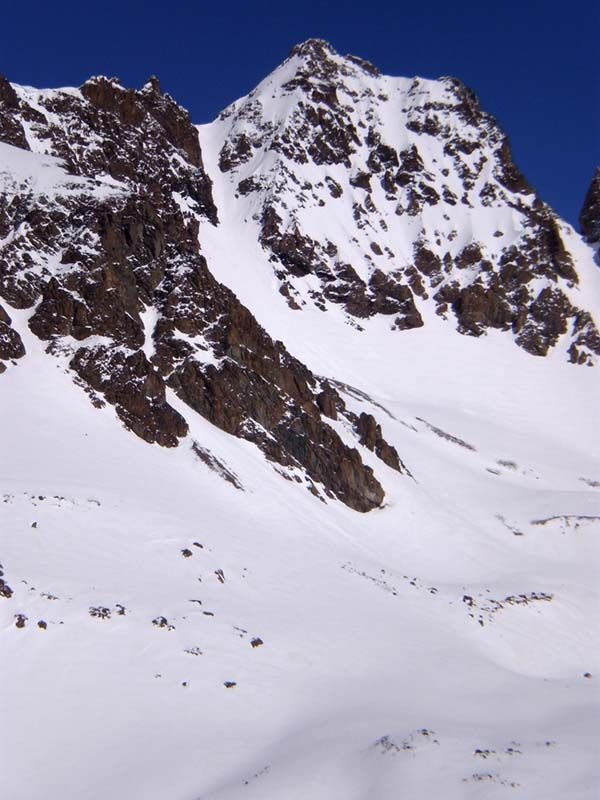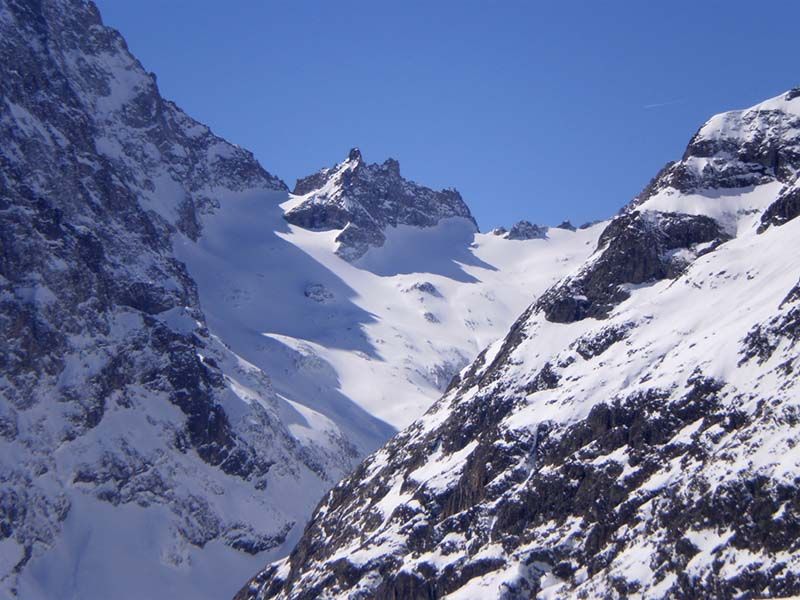 Du fait de mon changement d'objectif, j'ai dû traîner pas mal avant de descendre le couloir en bonnes conditions. À 13h15, poudreuse en haut en rive gauche, puis transfo correcte (juste en surface) en rive droite et enfin neige divinement revenue sous 2200. Bon ski jusqu'au pas d'Anna Falque, déchaussage sur 200 m à niveau ensuite puis pas de patineur pour rejoindre le Pied du Col. Vu seulement deux raquettistes dans le secteur qui ont remonté partiellement le couloir qui conduit au Vallon de la Route. L'un des deux avait skié ce couloir-combe la veille en plein jour blanc. La Calotte des Agneaux est en glace. Et gardez bien votre ENO, cette course n'est pas reprise dans ENO2 (m'enfin !). Le Vallon de la Route, qu'on découvre au dernier moment, est superbe. J'y reviendrai...