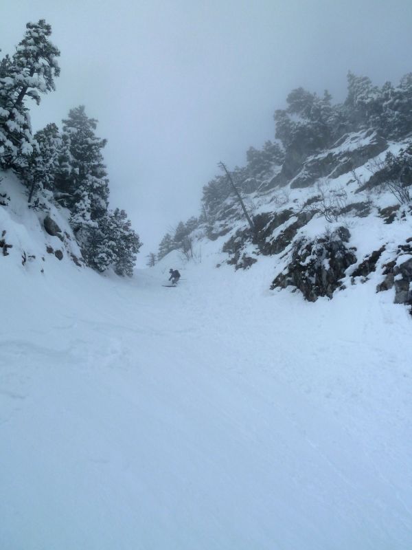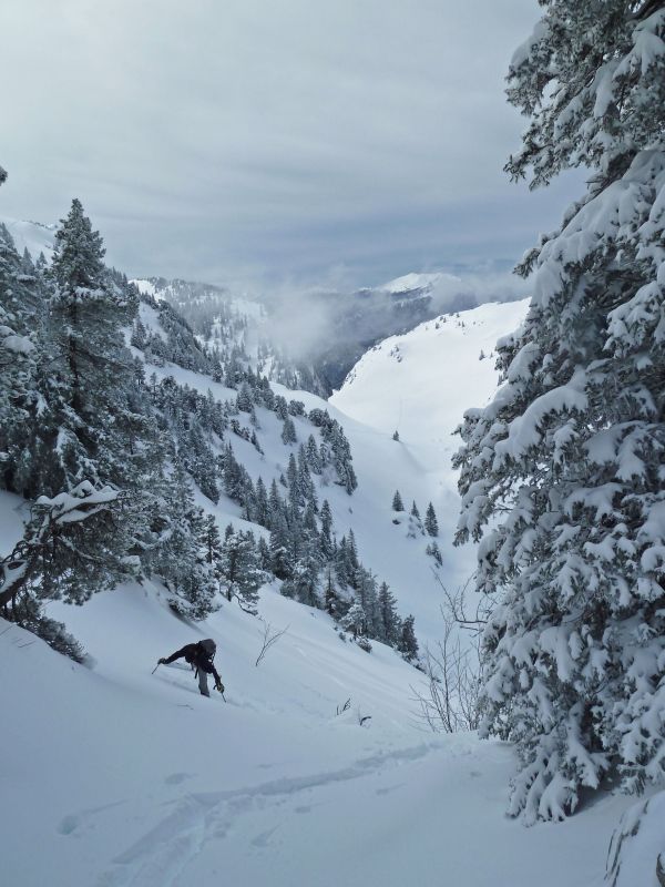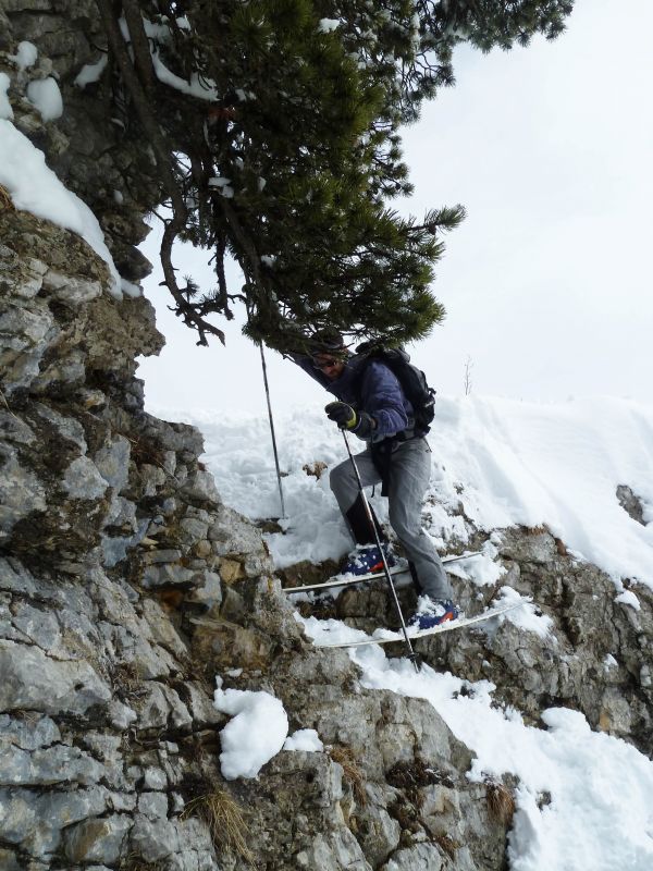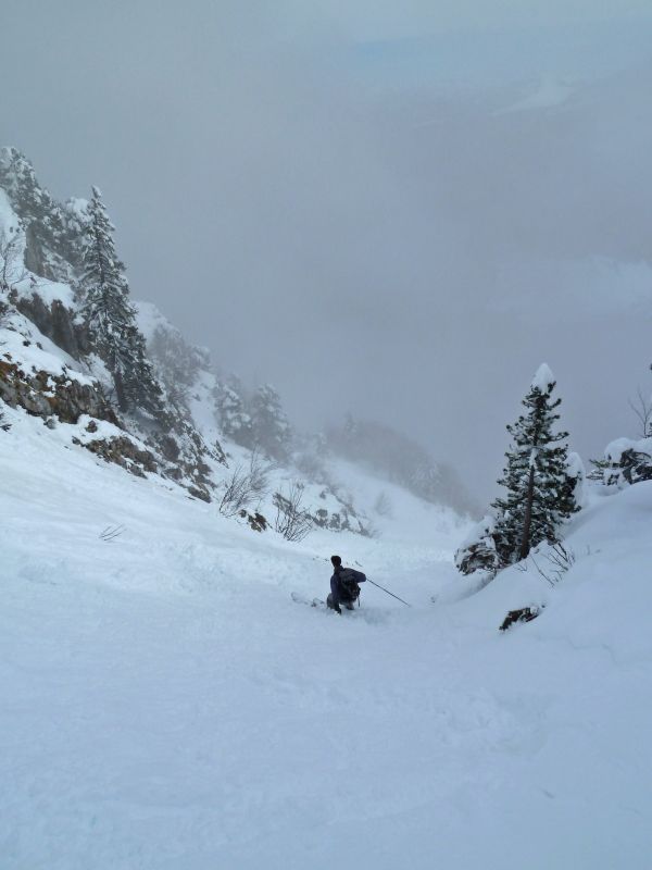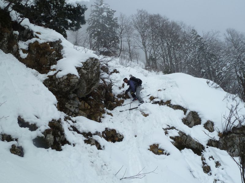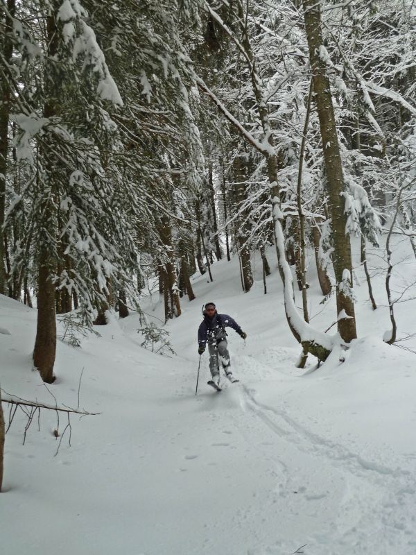 Seuls au monde dans la combe des Eparres, nous avons bien brassé pour tracer intégralement la montée. Nous avons passé les vires de sorties du couloir sans déchausser (prise d'arbre pour la deuxième vire). Finalement les conditions requises dans le commentaire du toponeige pour réaliser cette course étaient réunies... Dommage que ça s'alourdisse aussi vite et que les quantités de base en forêt soient faibles.