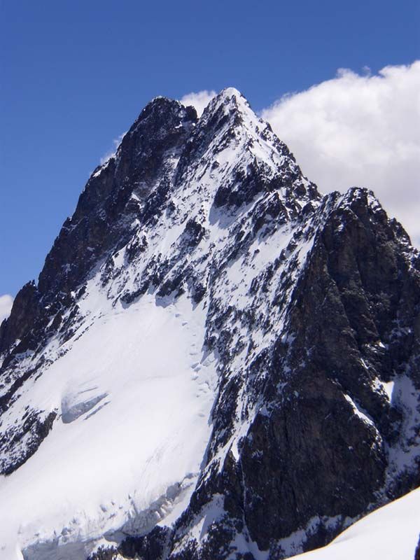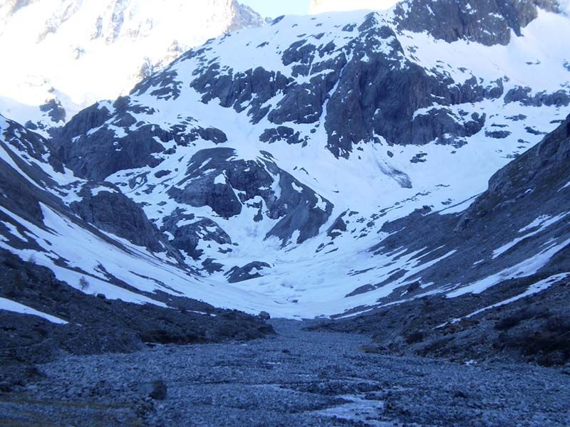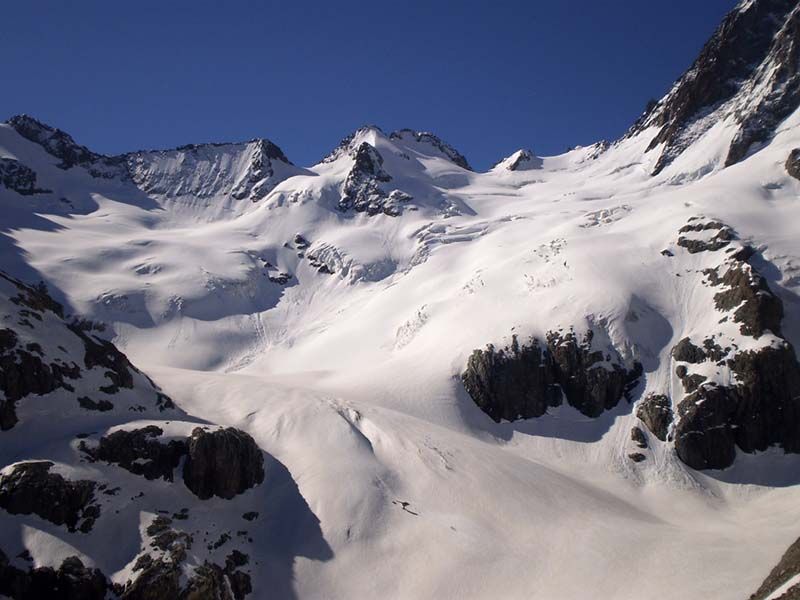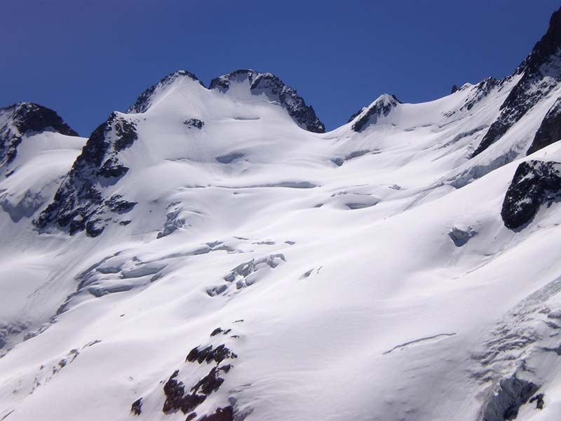 Sentier d'été jusqu'au refuge, puis sente balisée juste au-dessus sur 50 m. Ensuite, il faut prendre garde à ne pas trop monter, ce que j'ai fait (100 m de rab !), mais bien traverser jusqu'au glacier du Gioberney. J'ai fait l'impasse sur le sommet, l'ayant déjà gravi plusieurs fois. Descente sur le glacier de la Pilatte jusqu'à 2500 (loupé le début des vires, 20 m à remonter). Puis refuge par les vires câblées en partie.