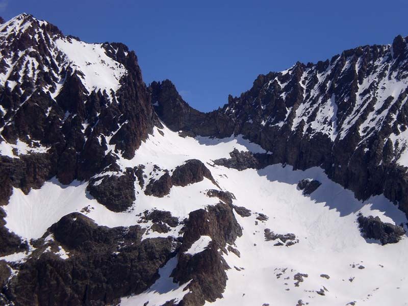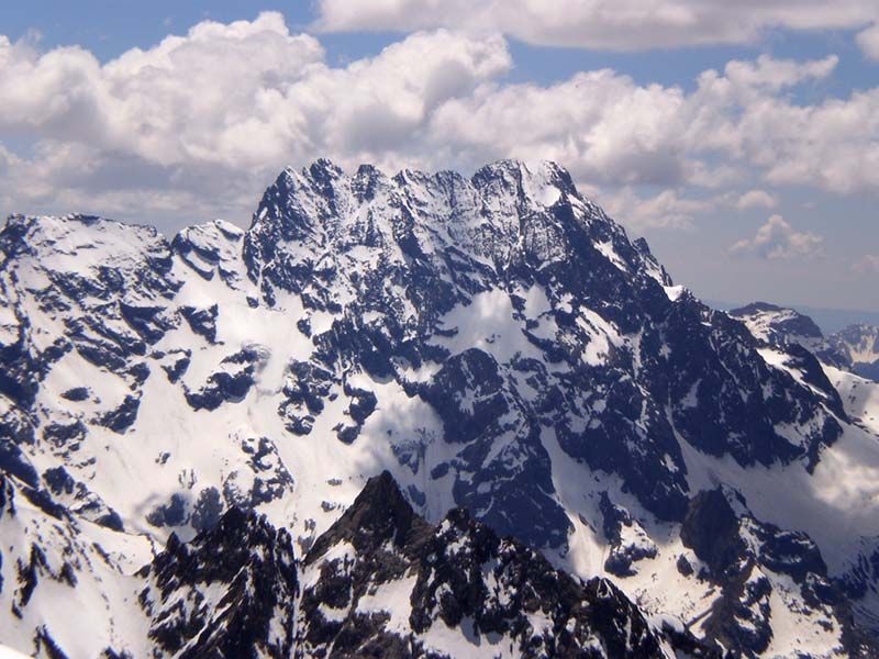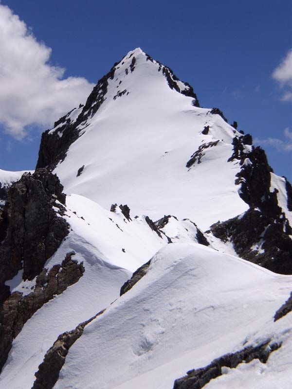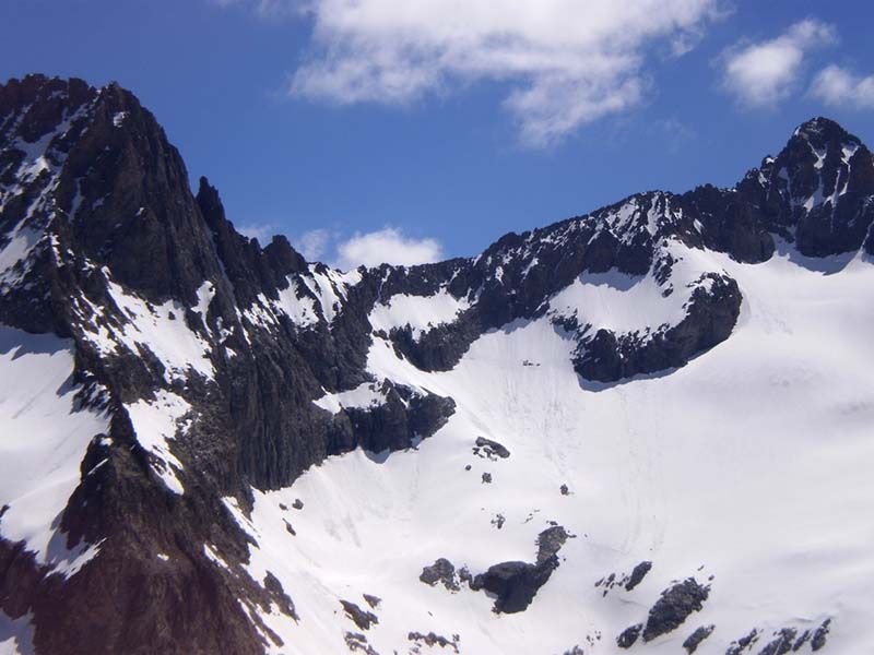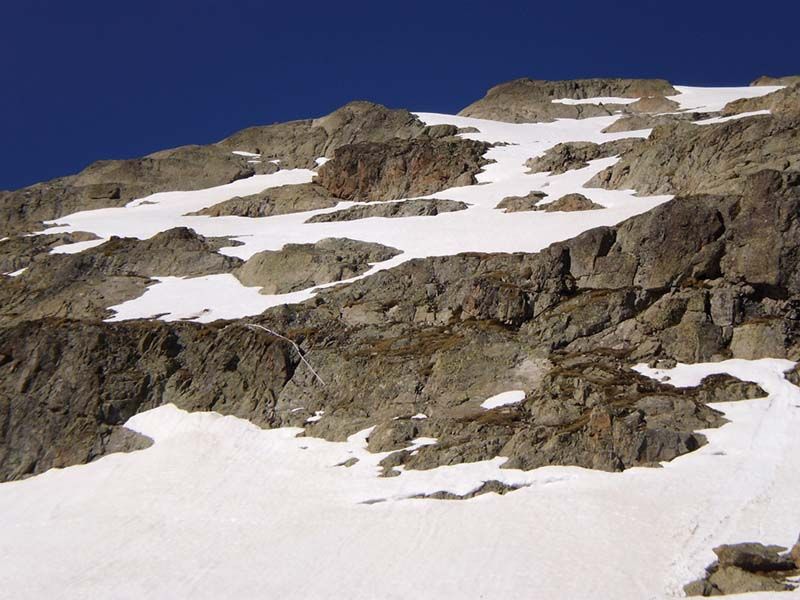 Attention au retour tardif au refuge par les vires, il y a encore des bandes de neige raides et exposées en neige ultra-molle (et pas de câble à ces endroits). Piolet et crabes impuissants... Et les câbles n'ont pas l'air d'être tout le long en parfait état (plusieurs spits ont sauté et quelques marques d'impacts). Deux skieurs m'ont précédé par la voie normale et ont fait l'aller-retour au sommet ; ils sont descendus vers 10-11h. 5 alpinistes sont arrivés au refuge dans l'après-midi, 4 d'entre eux ayant gravi le glacier du Says par les séracs (glace en assez bonnes conditions, à gratter un peu pour trouver de bons ancrages). Petite averse vers 16h et pluie plus soutenue vers 19h. J'avais l'intention d'aller à la pointe Richardson, mais j'étais trop tard au col (13h). Dommage...