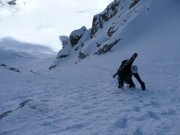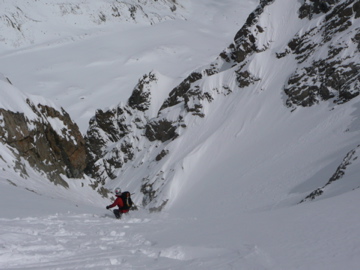 très bonnes conditions ce jour mais qui ne devraient pas durer:la face est ouverte à l' ouest et à 13h elle est au soleil de haut en bas:il a fait chaud cet après-midi!Comme LTA le mentionne dans le topo,les grandes courbes se prettent particulièrement à cette face et nous ne nous sommes pas géné pour mettre en pratique!