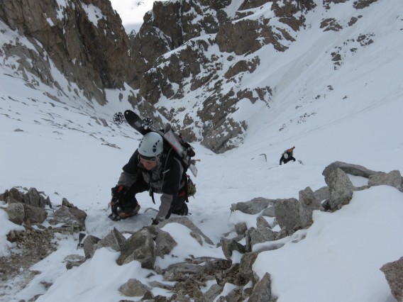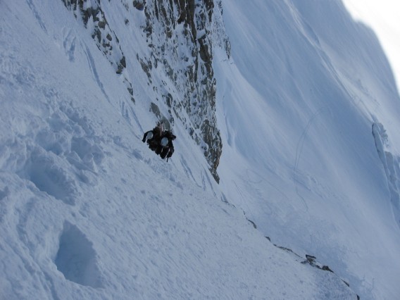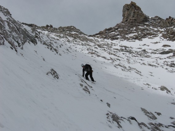 Un lève tôt nous a précédé d'au moins 1h30! Du coup il s'est offert le couloir vierge alors qu'on était encore sur le glacier noir. Nous ne nous sommes pas gênés du coup, et il restait de la place pour tout le monde sauf pour les 50m du haut ou la neige était précieuse pour pouvoir déraper sereinement au milieu du champ de mines: notre prédécesseur a posé quelques dry virages osés...respect. Le soleil de mai de la splendide journée de la veille a déjà fait son action de transformation: légère croute en NO et début de grainfinisation en N.