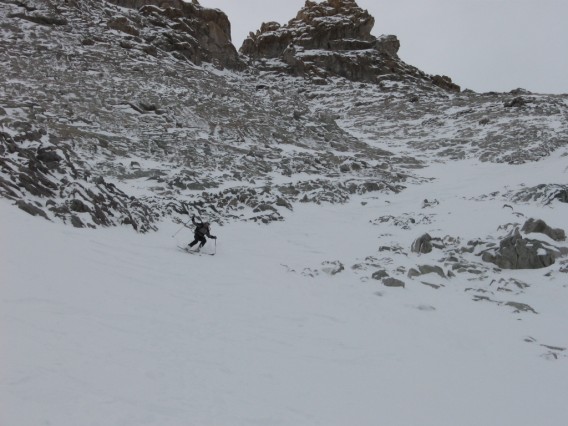 Couloir N: en partant du bas (orientation NO) neige croutée gelée sur les 20 premiers m puis 40 de poudre dense avec légère croute froide en surface sur les 100 premiers m mais ne gênant pas le ski , reposant sur un fond dur. Ensuite à partir du coude (orientation N), le fond est en grain fin puis les 50 derniers m sont un vrai champ de mines: 20 de poudre sur grain fin tendre parsemé de dalles et cailloux. Dry Skiing sur ces 50 m.