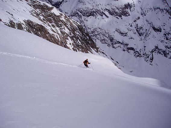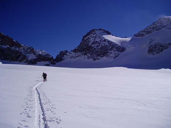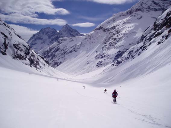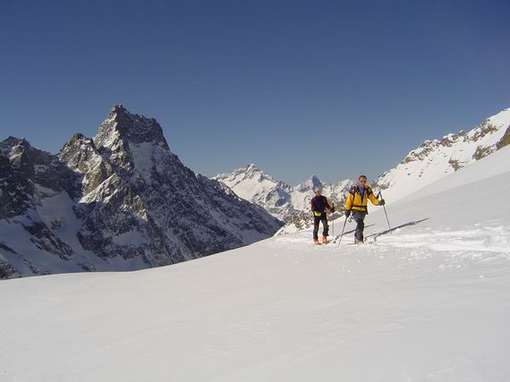 Parti pour faire un tour "Paysages-Grosses cuisses-Couloir" (Replat, Brèche de la Gandolière, accès versant E, descente par couloir O), nous avons échoué à la remontée vers la brèche pour cause de nivo peu sûre. De plus, le temps se gâtait, le froid nous avait attaqués, la montée à la brèche semblait très délicate, et la descente en neige incertaine, avec des cailloux dans le couloir (été 2003...). Descente du Replat vers Chatelleret très belle. Vue sur massif Grande Ruine de premier ordre. La route de la Bérarde passe en voiture.
