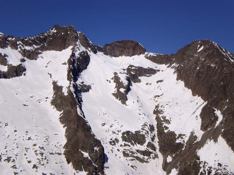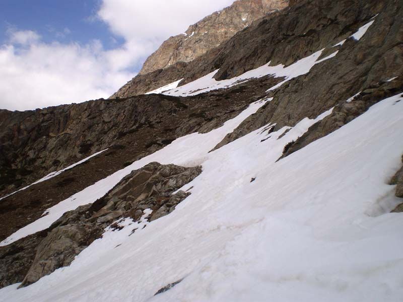 Une coulée de plaque (corniche ?) est partie du haut du couloir NO (sortie à 3373 m) et a bien abîmé les pentes dans l'axe. Le couloir lui-même n'est pas tentant, vagues dures. D'autres coulées se sont réunies pour constituer un front assez copieux et large en bas du vallon vers 2500. La transfo du haut sur les 100 derniers mètres n'est pas complète et à l'heure où je montais (entre 12h30 et 13h), elle était un peu trop molle et tendait à glisser sur le fond dur. Arriver une heure plus tôt aurait été mieux. La traversée du bas était en neige bien molle entre 15h et 15h45, mais en neige suffisamment dense pour bien tenir.
