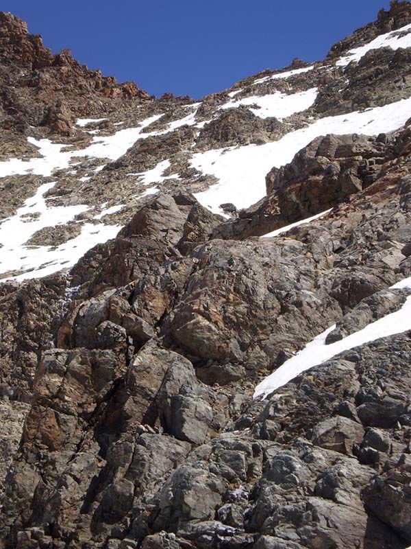 Trouver son chemin entre 2250 et 2400 n'est pas simple, surtout quand on a les conditions sèches du moment. Comme j'ai chaussé les crampons dès le début, j'ai cherché à passer au maximum sur la neige, ce qui m'a conduit à monter un peu trop haut, puis à traverser à gauche en légère descente (quelques courts passages sur rochers). Au retour, j'ai dû déchausser deux fois sur une centaine de mètres (tout en descendant d'une cinquantaine) et je me suis quand même débrouillé pour me laisser aspirer par un joli couloir qui tombe sur une petite cascade ! Heureusement, on trouve un petit passage à droite avec une remontée à pied d'un mètre. Au milieu de la traversée expo, comme j'étais monté un peu haut pour éviter des rochers, j'ai poursuivi vers le haut et j'ai gravi un petit couloir qui se termine en mixte et quelques pas d'escalade pour gagner le vallon vers 2600. Sans intérêt...