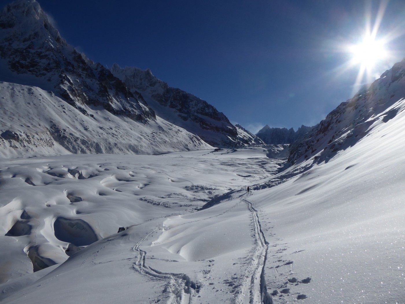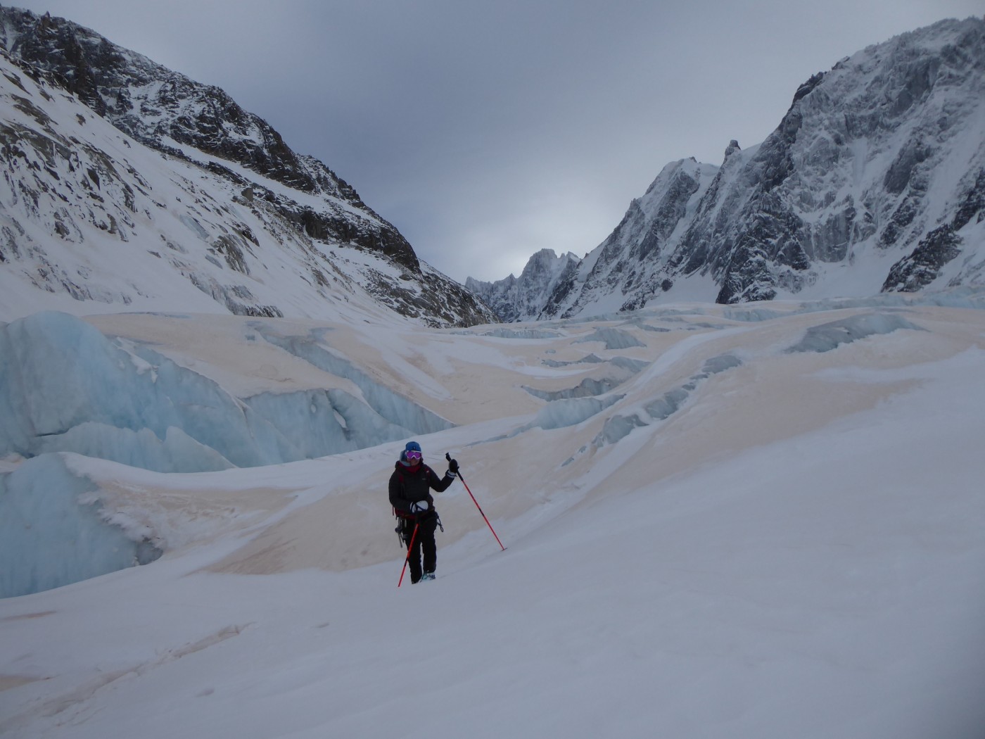 Montée par la piste de la Pierre à Ric puis chalet de Lognan, Point de Vue, glacier d'Argentière vers la rive droite puis comme C14. Descente par le même itinéraire.