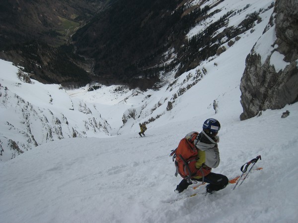 Montée sous le couloir du Varo, dans le couloir à la bifurcation je laisse le soin à mes collègues de s'occuper de la cascade de glace! Je remonte F1O (couloir central) et eux la variante directe. Jonction au sommet . Descente de la directe jusqu'à la cascade de glace du haut (Stéphane l'acrobate arrive quand même a passé! il déchausse au dessus de la cascade du bas). Remontée au col pour tous et descente du central, remontée par mes soins!