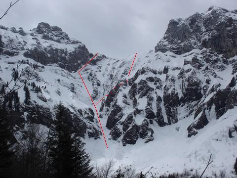 Pour ces deux couloirs on est dans le 5.3 avec forte exposition (pente plus soutenue pour le central et plus technique pour la directe).