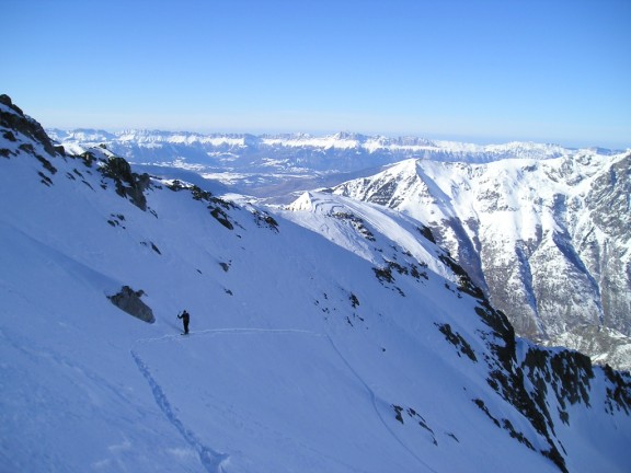 Partis un peu au hasard nous avons enfin pu découvrir ce vallon magnifique. Cet itinéraire était à peine tracé (2 veilles traces visibles uniquement par endroits) alors que tous les autres commencent à l'être sérieusement (C10, C8). Les faces manquent encore beaucoup de remplissage mais c'est moins pire que dans certaines régions (Hier nous étions en cascade en haute maurienne: les sommets sont très pelés). Seul Bémol ojdh: le vent de Sud glacial et soutenu qui nous a obligé à rester à l'ombre au sommet et a coupé nos velléités de grande boucle.