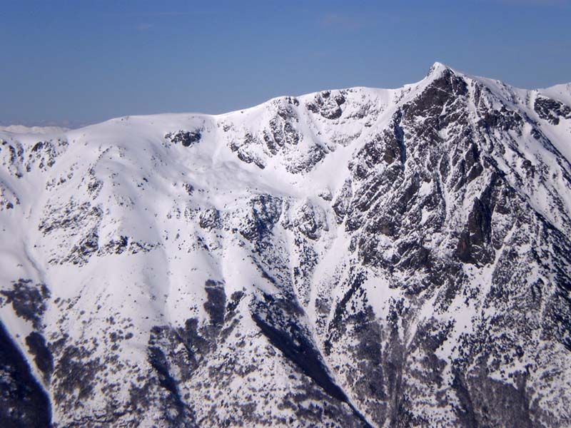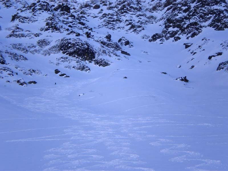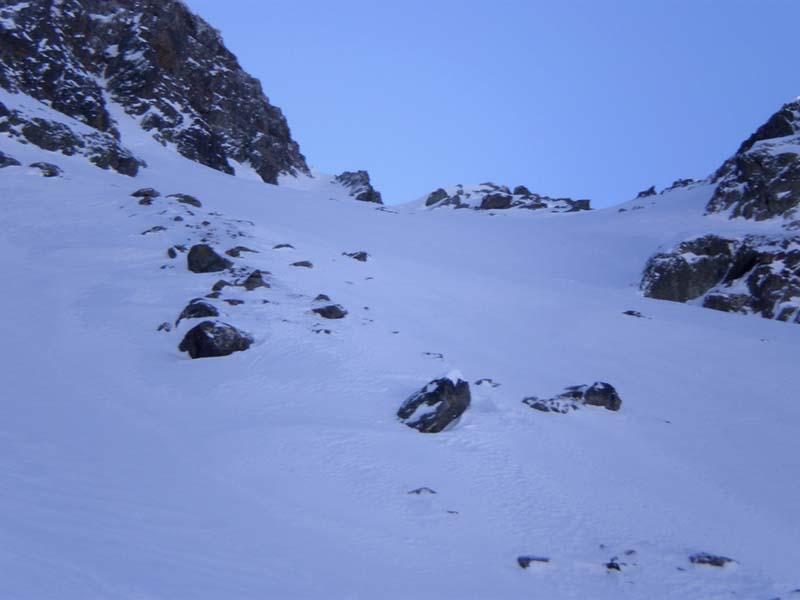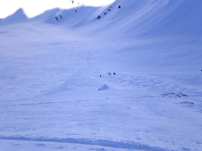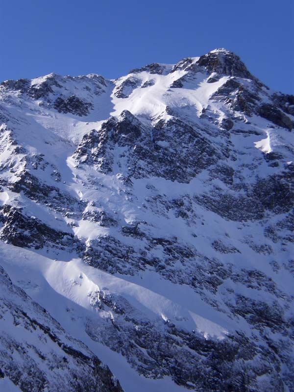 Stop vers 2300 m, au moment où les pentes s'orientent au nord. Le vent a fait trop de misères et la neige rapportée n'adhère pas du tout sur un fond soufflé dur, voire sur des gobelets... Cinq skieurs murois qui s'étaient arrêtés peu avant nous avaient décidé de faire demi-tour : nous n'avons en rien contesté leur avis...