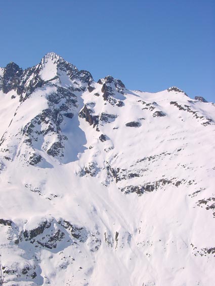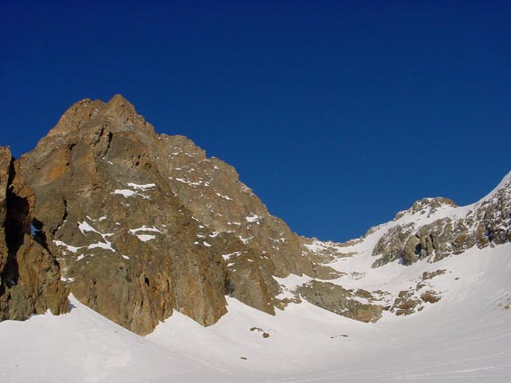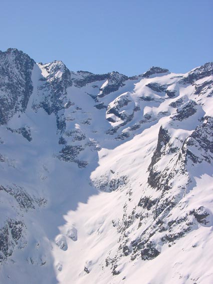A saisir, ce qui vaut aussi pour les Fetoules, d'ailleurs. Neige poudreuse en haut, transformée au milieu, dure sur le chemin, ski intégral. Je me suis tout de même arrêté 80 m sous le col en raison d'une accumulation sur la rive droite, pas méchante, à deux j'y serai allé, mais pas seul. J'aurai pu aussi passer en rive droite (rocher, un peu de glace, neige dure comme les verrous du dessous) mais je m'étais aperçu dans le précédent que mes crampons étaient réglés pour des petites chaussures et je n'avais pas d'outil (ça doit faire deux mois maintenant que ces crampons inutilisables étaient au fond du sac…charlot !!!). A part ça super course, dont l'ambiance rappelle l'encoula de petit pierre (B33), en un peu plus facile.