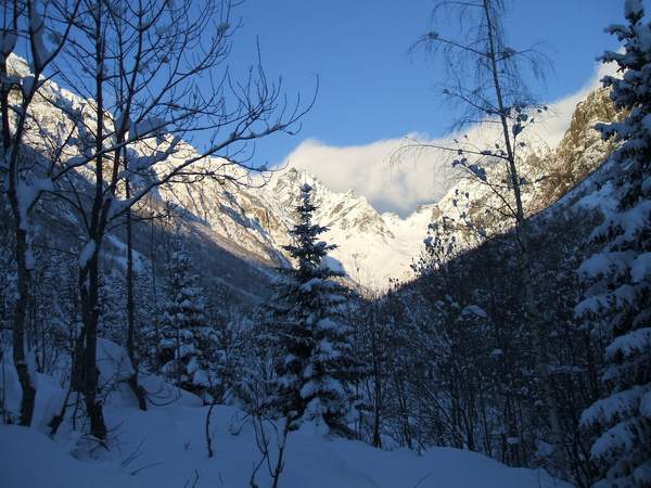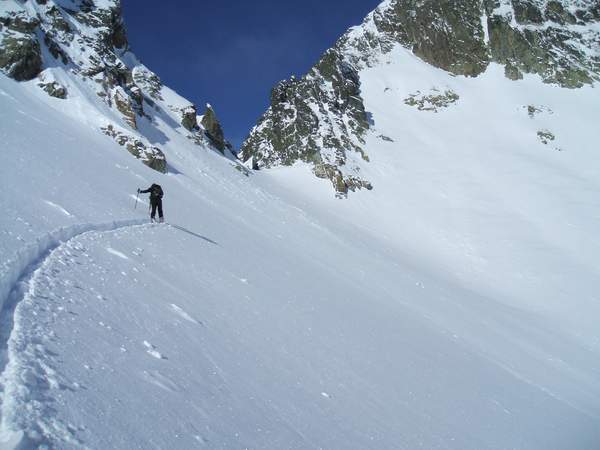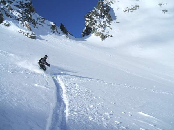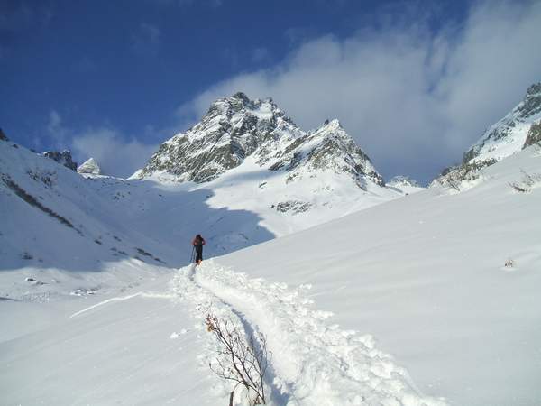 Grosses quantités de neige dans le tiers supérieur du vallon, localement quelques accumulations. Les versants sud se transforment petit à petit tandis que les pentes orientées est et nord conservent une poudreuse de cinéma. La forêt passe bien à la montée, déchaussage ou vieux skis pour la descente.