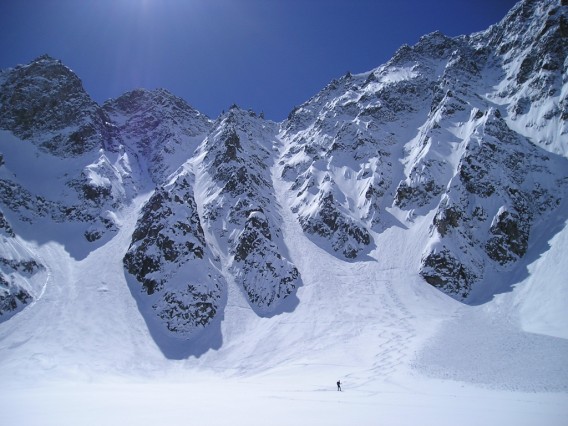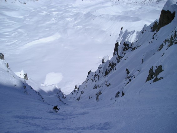 En rusant bien on skie en continu jusqu'au ruisseau à 1760 à 5 min de la voiture mais ca ne va pas durer longtemps. Dans le couloir : partie centrale coté rive droite: purgée (reste de rupture de plaque visible) tassée par les coulées=> grain fin. Rive gauche et sortie directe: plaque friable d'apparence poudreuse (on en a déclenché 2 lors de virages : départ sous les skis sur 5-6m de large ). On voit un peu partout des vestiges de plaques assez importantes recouvertes ou non par la dernière couche de fraiche. Sinon ce jour bonne stabilité des pentes ensoleillées: T° encore fraiches et pas de purges naturelles observées (jusque vers 13h00).