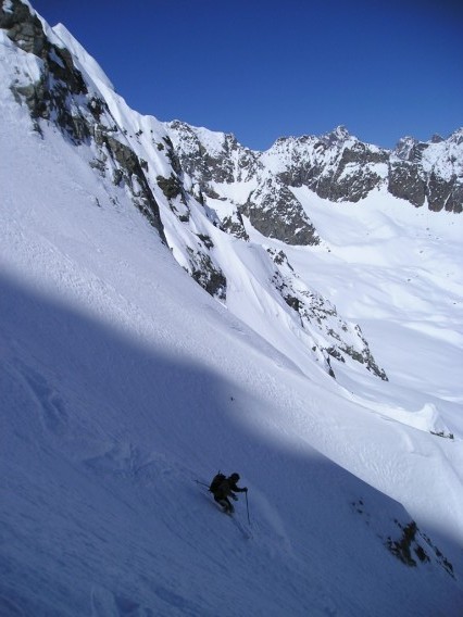 Une bien belle journée avant l'arrivée annoncée d'un WE pluvieux. Bonnes conditions dans le couloir N mais gare aux plaques friables . Ce couloir est vraiment très esthétique, notament l'arête qui le sépare de son voisin. Le piaget n'est pas au mieux de sa forme (3 personnes dedans-pas vus descendre): déjà gouloté avec boules et glace dans sa partie centrale. Sommet de la calotte et dernier ressaut de l'arete finale en glace