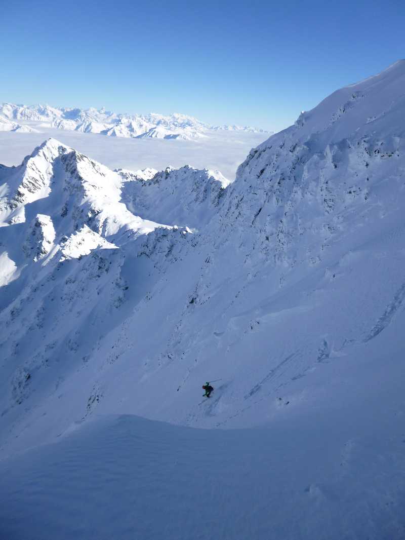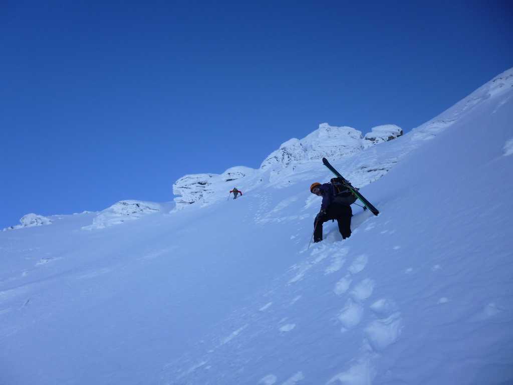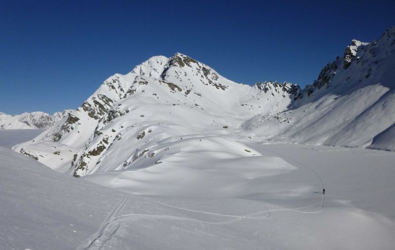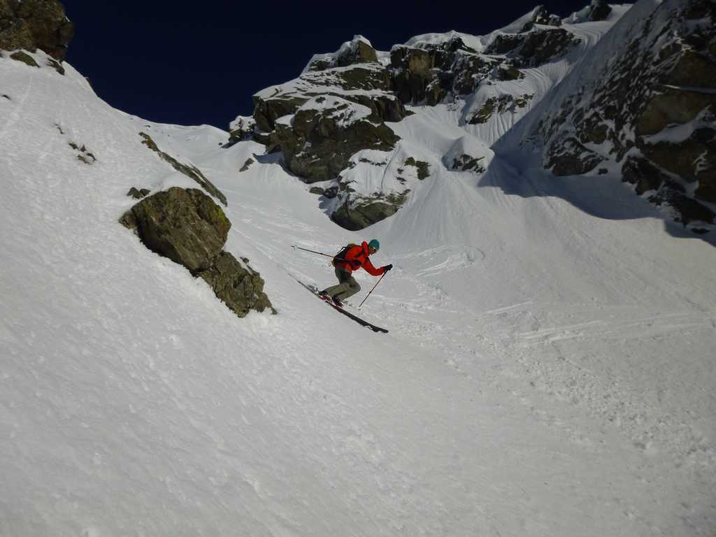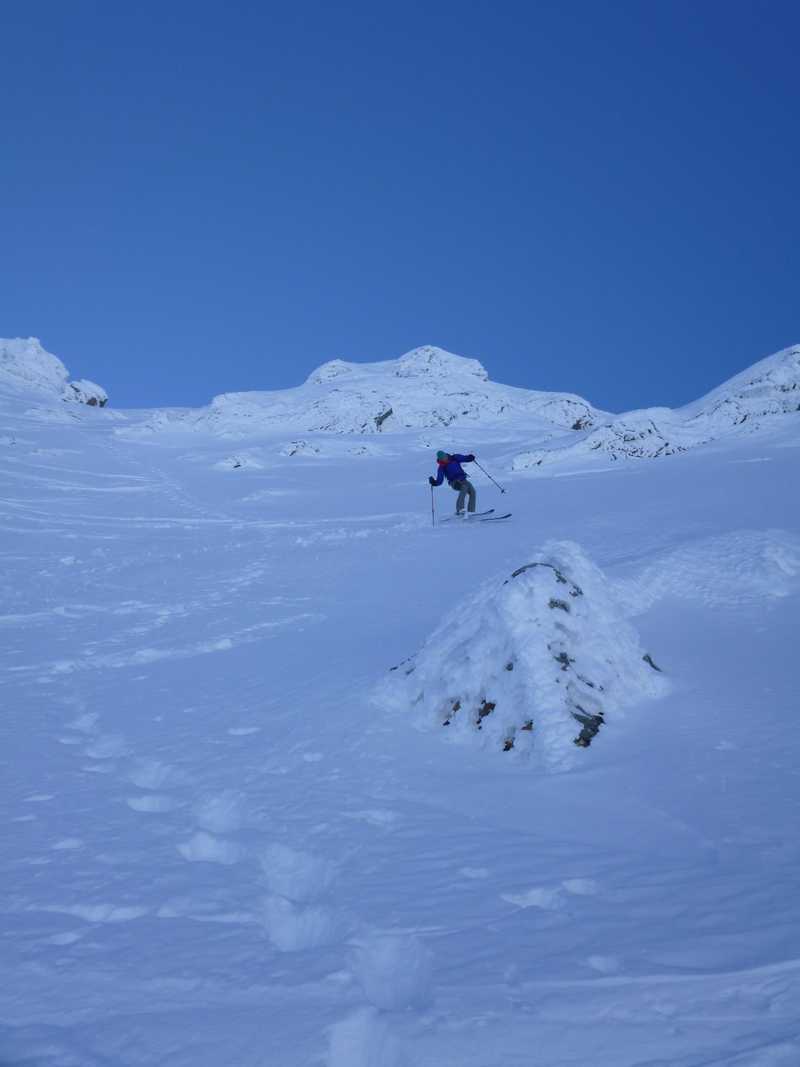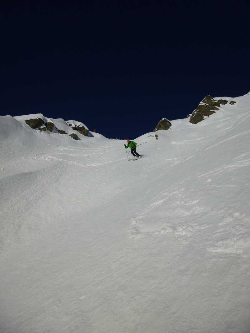 On aura eu un peu tous les types de neige : poudre, soufflée, croutée dans la face N du Colmet, transfo, croutée, soufflée, poudre dans le couloir ouest de la Pougnenta. Glogalement le manteau nous a semblé assez sain aussi bien côté nord que ouest.