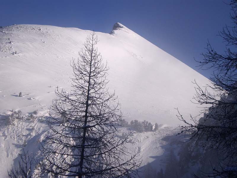 Au-dessus de 1600, les pentes sont assez soutenues et au-dessus de 1767 assez raides sur 80 m, ce qui demande des précautions. La neige est très homogène, parfois très faiblement humidifiée et elle repose sur une couche humide datant de la pluie du 3-4 mais assez profondément enfouie. Là où je suis passé, peu d'activité du vent mais un peu plus à l'ouest du GR50 vers 1800. Entre 1767 et 1885, la pente avoisine les 40° et on trouve parfois des plaques friables de 30 cm d'épaisseur en surface, mais en jouant avec les arbres, on passe assez serein.