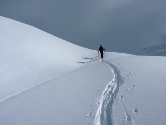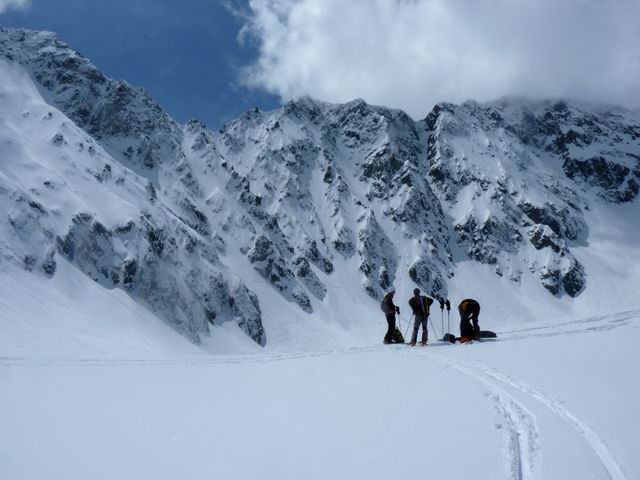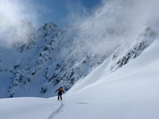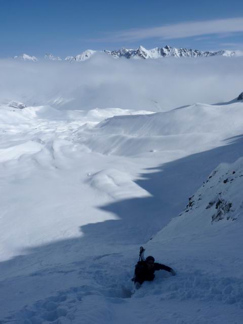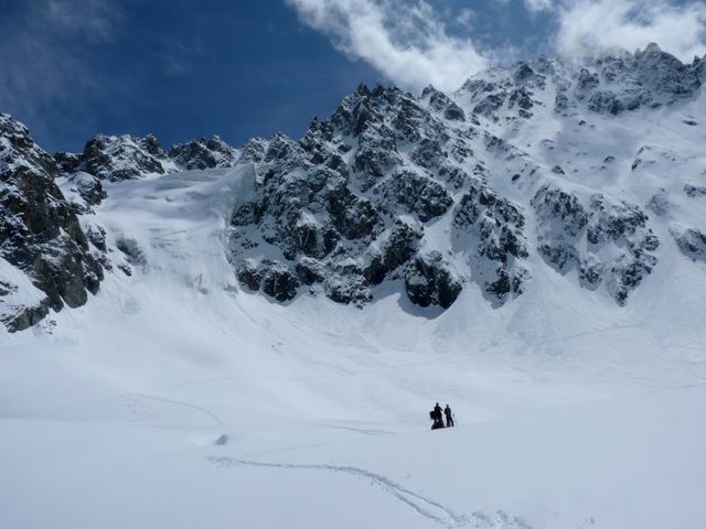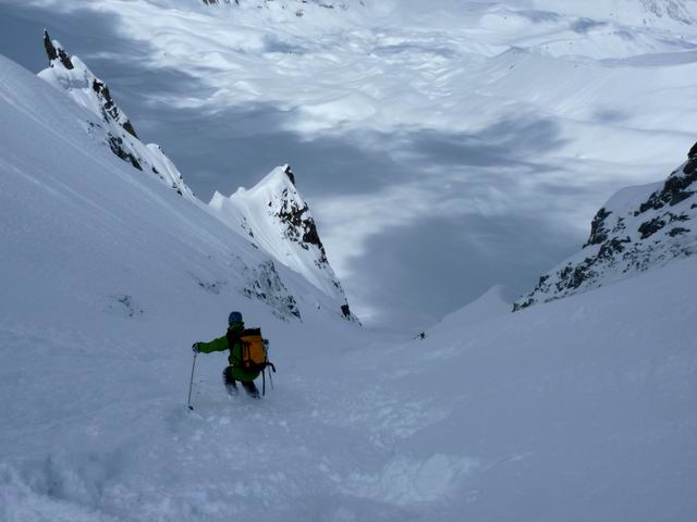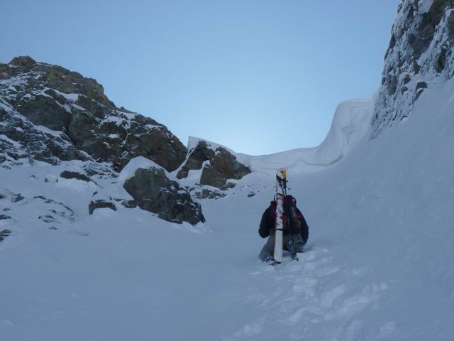 Beaucoup de neige dans le couloir, mais entre la goulotte et les irrégularités cachées sous la poudre, ça reste assez technique. La couche de la nuit part en petites plaques pas épaisses, mais qui prennent vite de la force dans une goulotte.
