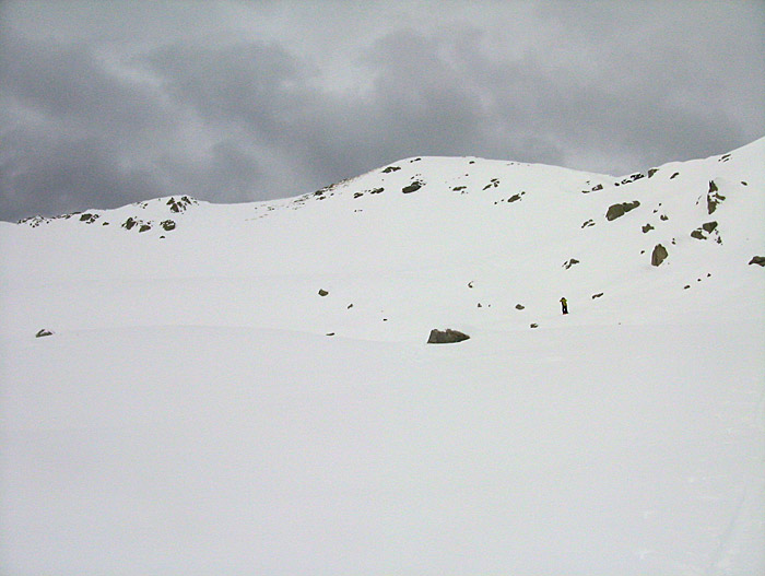 Au niveau de la sortie du couloir Est, en suivant la petite arête/croupe qui mène au sommet, on a fait partir une accumulation cornichée qui donnait sur le versant sud, et qui a glissé lentement sur 20m