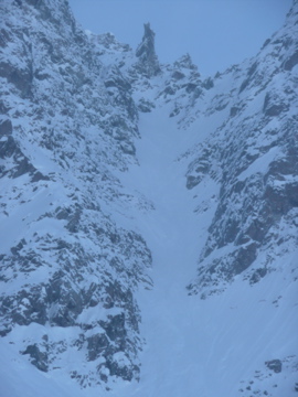 grosse quantité de neige dans le couloir, en grande partie en raison des purges des falaises qui le bordent.