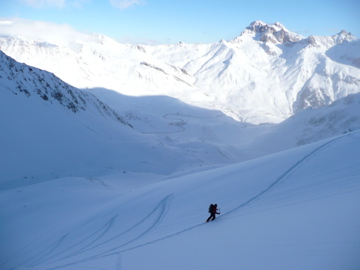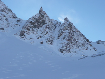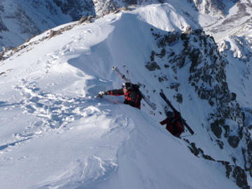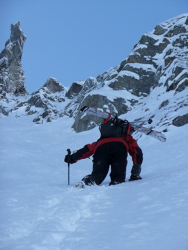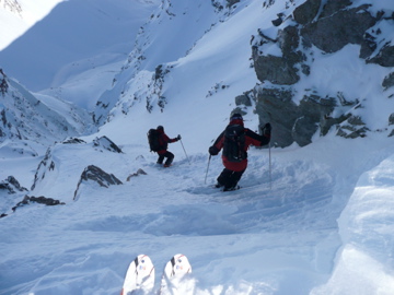 Nous cherchions de la poudre,au sud,abritée du vent: rien de tel qu' un petit couloir encaissé. gros brassage à la montée et couloir en excellentes conditions aujourd'hui.