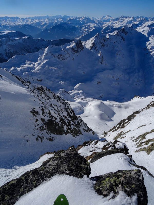 D18 intégralement, sauf pour la remontée finale où nous avons shunté la 1ère partie de l'arête ouest du grand Mont en remontant la face ouest à ski, arête rejointe vers 2550 par un couloir évident sur la droite.