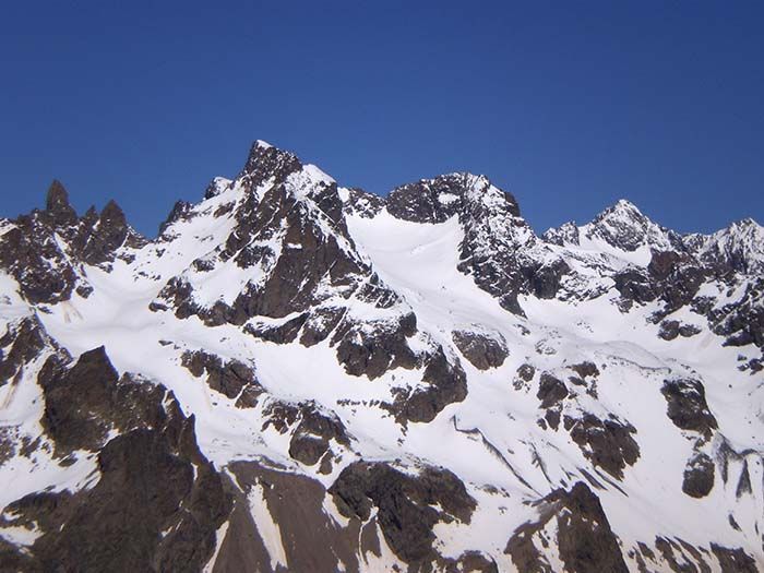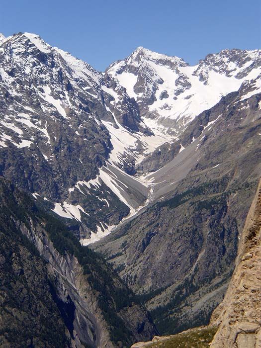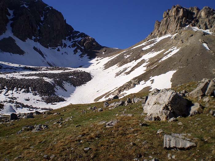 Rive droite du riou la Selle jusqu'au cirque de Bas Morand puis pente orientée sud-ouest pour gagner un col au sud du point 2719. Traversée en versant est sous le point 2737 et montée directe au sommet avec deux déchaussages en raison de dalles proches de la surface. Descente sud et ouest en direction du col de Bas Morand. Comme il y avait 4 déchaussages pour le gagner par gravité, j'ai préféré descendre la belle pente ouest jusqu'au point 2517 et remonter au col. 25 m secs puis neige presque continue jusqu'au replat à 2320 m (3 déchaussages brefs). Fin comme montée.