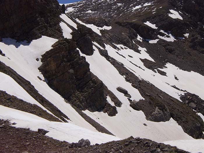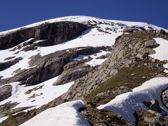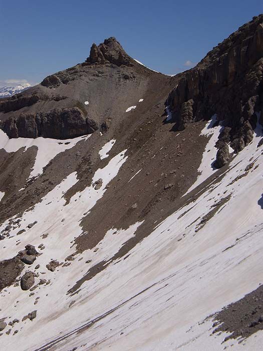 Je n'ai pas vu de couloir raide pour accéder au col S du pt 2719, seulement une large pente à 30°. S'agirait-il d'un couloir plus à droite qui sort au sud du point 2737 (si je ne me trompe pas) ? Si c'est le cas, aujourd'hui il ne passait pas : rochers raides et humides en haut. Difficile de faire ce tour en respectant partout les bonnes heures : la montée au sommet doit se faire tôt, tandis que la descente des pentes ouest, assez raides (passages à 40°), demandait ce jour à attendre au moins 11h. Je les ai descendues à 11h45 et elles étaient tout juste à point. Bilan : 720 m de ski, dont 450 d'excellent, pour 1330 m de montées, je passe la moyenne, mais je ne respecte pas le ratio de 40/60...