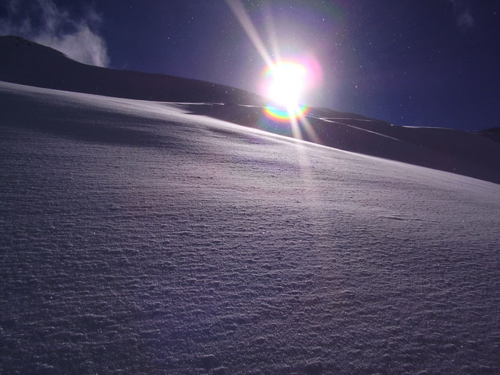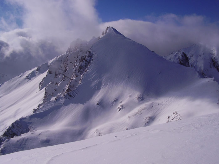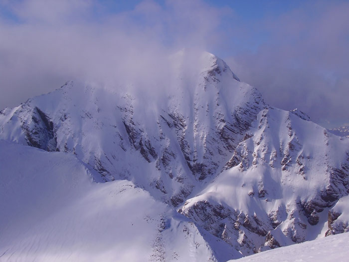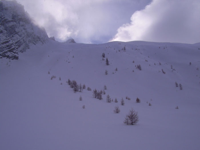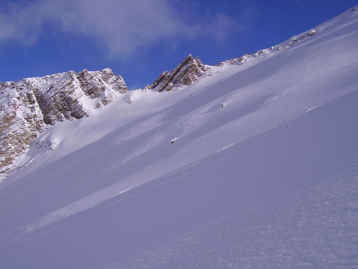 Descente somptueuse dans une poudreuse assez stable et légèrement collante en bas de la face. Quelques nuages gênants qui m'ont obligé à patienter pour y voir clair.