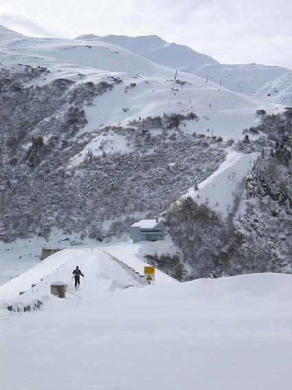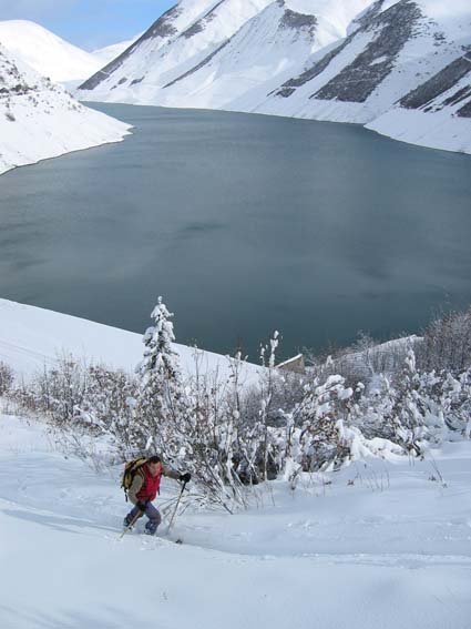 montée dans la combe nord des aiguilletes au-dessus du barrage.