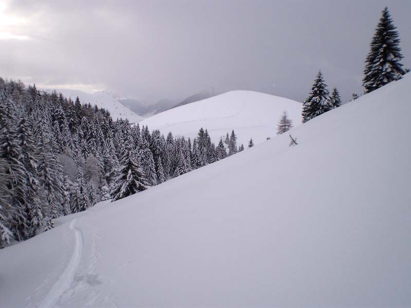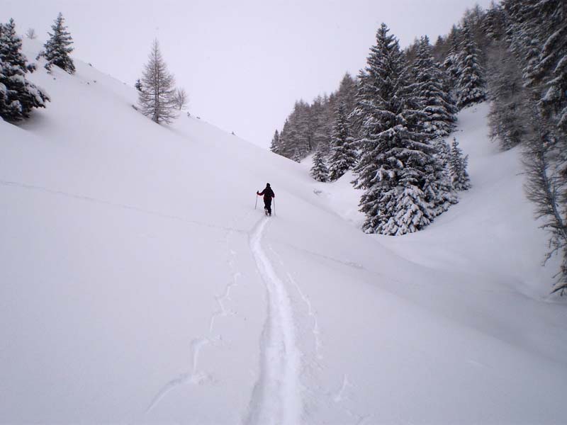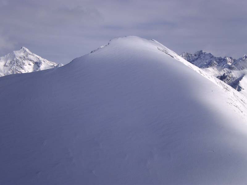 Avec risque 4 au-dessus de 2400 en Oisans et idem au-dessus de 1800 dans le Champsaur, il fallait choisir une petite rando à pente faible aujourd'hui et avec les bonnes orientations. C'était exactement ce qu'il nous fallait, avec un Œil attentif aux pentes à 30° au-dessus de la combe Chaude, mais qui sont orientées sud puis sud-est. Des restes de plaques décrochées sans doute la veille ou l'avant-veille ont presque atteint le torrent. De petites plaques de surface en cours de formation sous vent de nord aux abords du col. Les pentes sud-ouest un peu soutenues (35° sur 100 m) sous le sommet sont saines pour le moment, poudreuse sur fond très ferme.