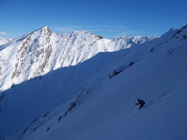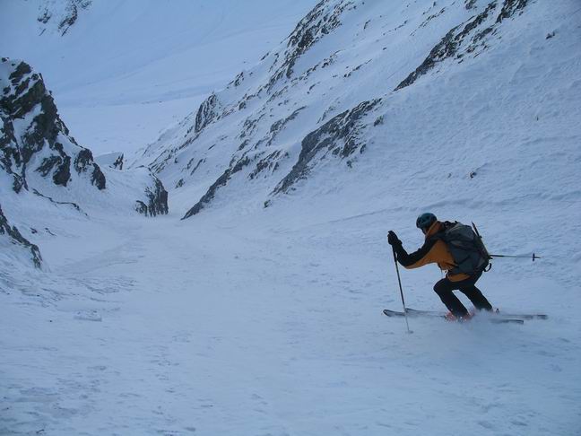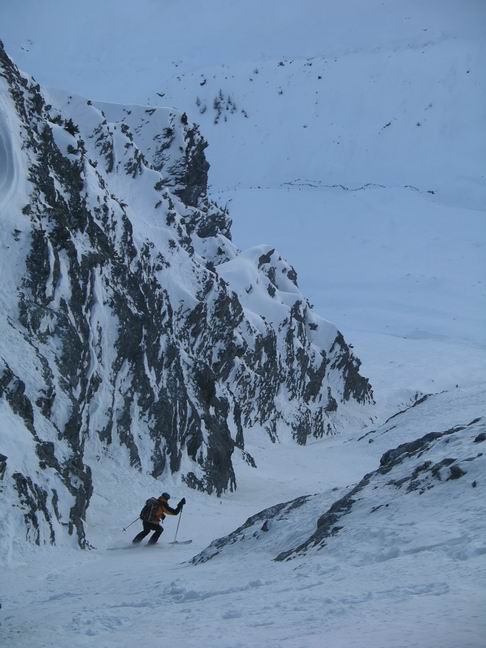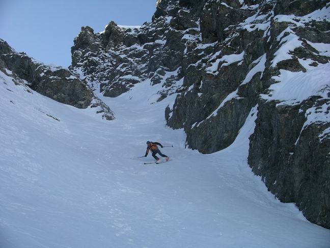 Neige très irrégulière en W (alternance de cartonnée / poudre), dans les cônes des couloirs, soit grins fins, soit poudre, soit cartonnée, dépend un peu des talwegs. Dans les couloirs, globalement du grain fin au milieu, de la poudreuse en rive gauche et carton en rive droite. Les sorties de couloirs = 50 m (moins raide et + propice au vent) il faut se méfier, parfois plaqué, parfois poudre, avec face plane en profondeur. Une croute (peu épaise) entre l'ancienne couche et celle de lundi. Pas encore de gobelet.